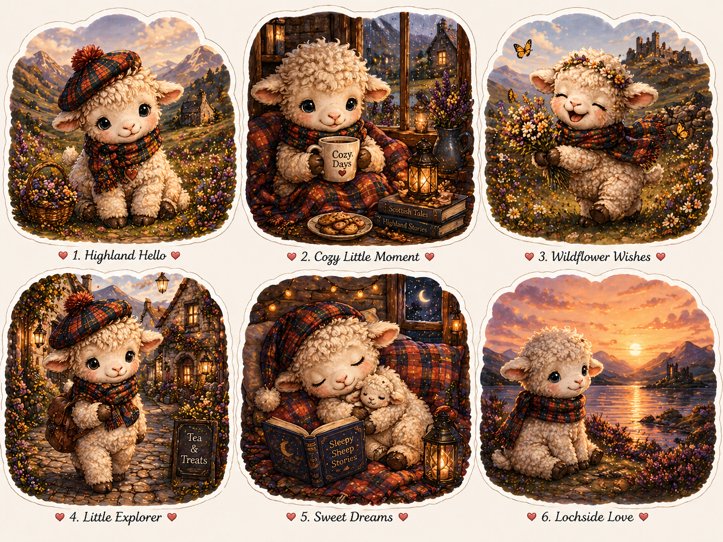 Fluffy the Little Lamb โ Highland Dreams Sticker Pack ๐ - ๐ธ Whatโs included: 6 high-quality PNG stickers Transparent backgrounds Large, detailed illustrations (perfect for print & digital use)