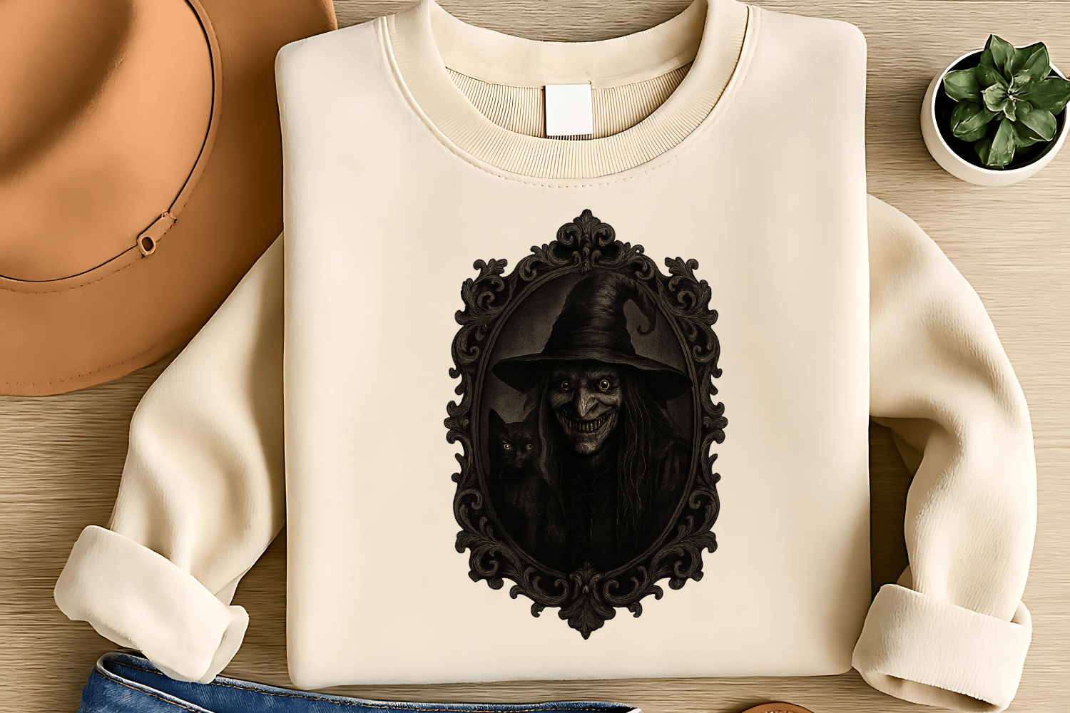 Grinning Witch Portrait Sublimation PNG – Creepy Halloween Clipart for T-Shirts – Gothic Frame & Black Cat Theme – 300 DPI Instant Digital Download