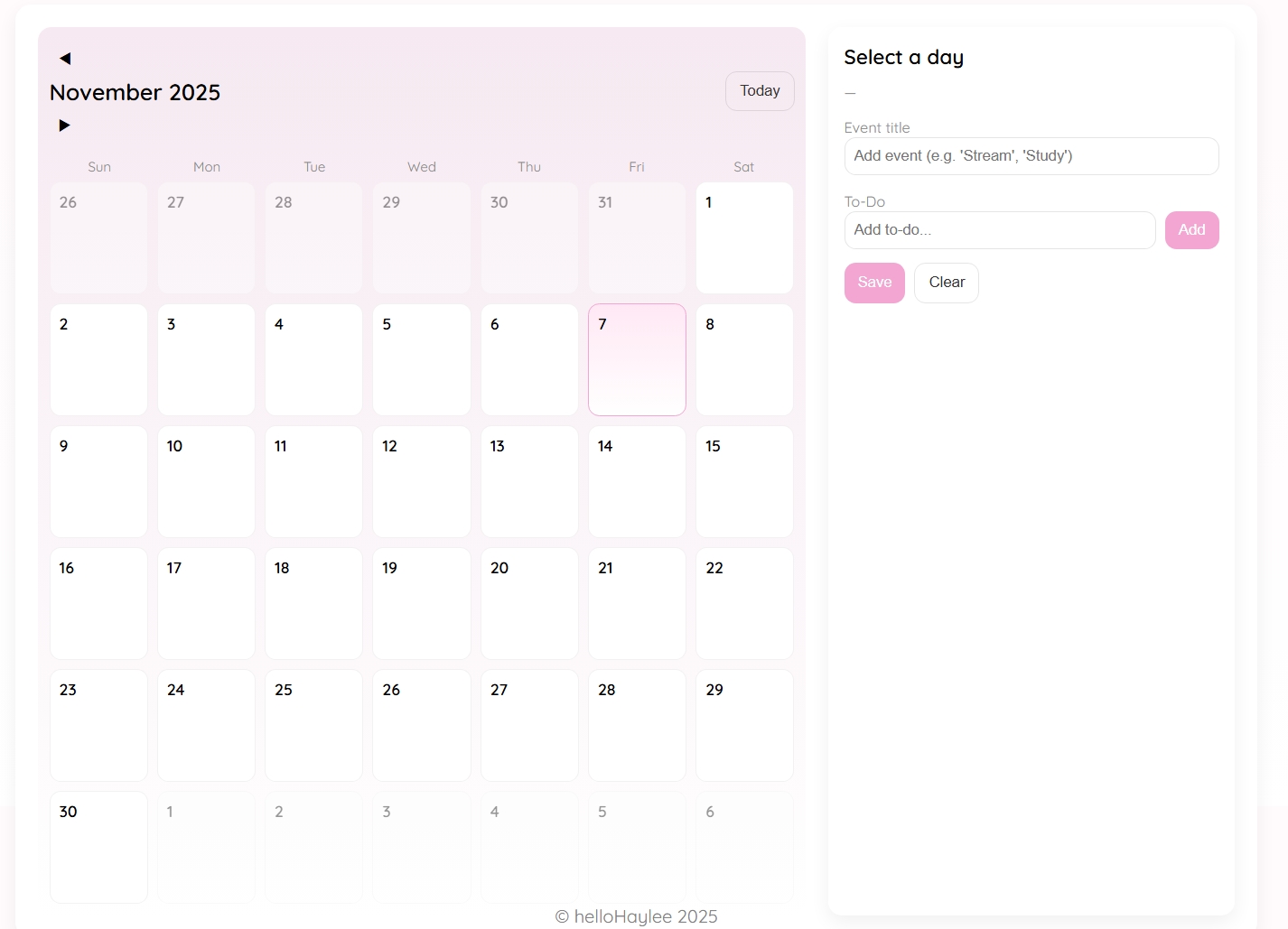 This fully responsive calendar shows the correct month and year, lets you add events and to-do items directly onto each day, and works on both desktop and mobile.