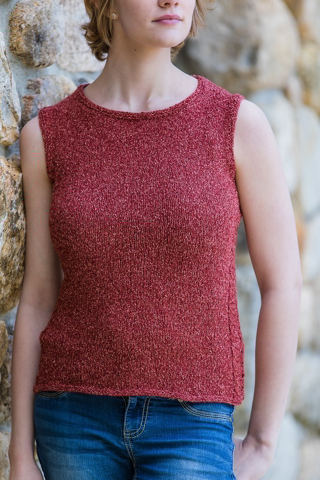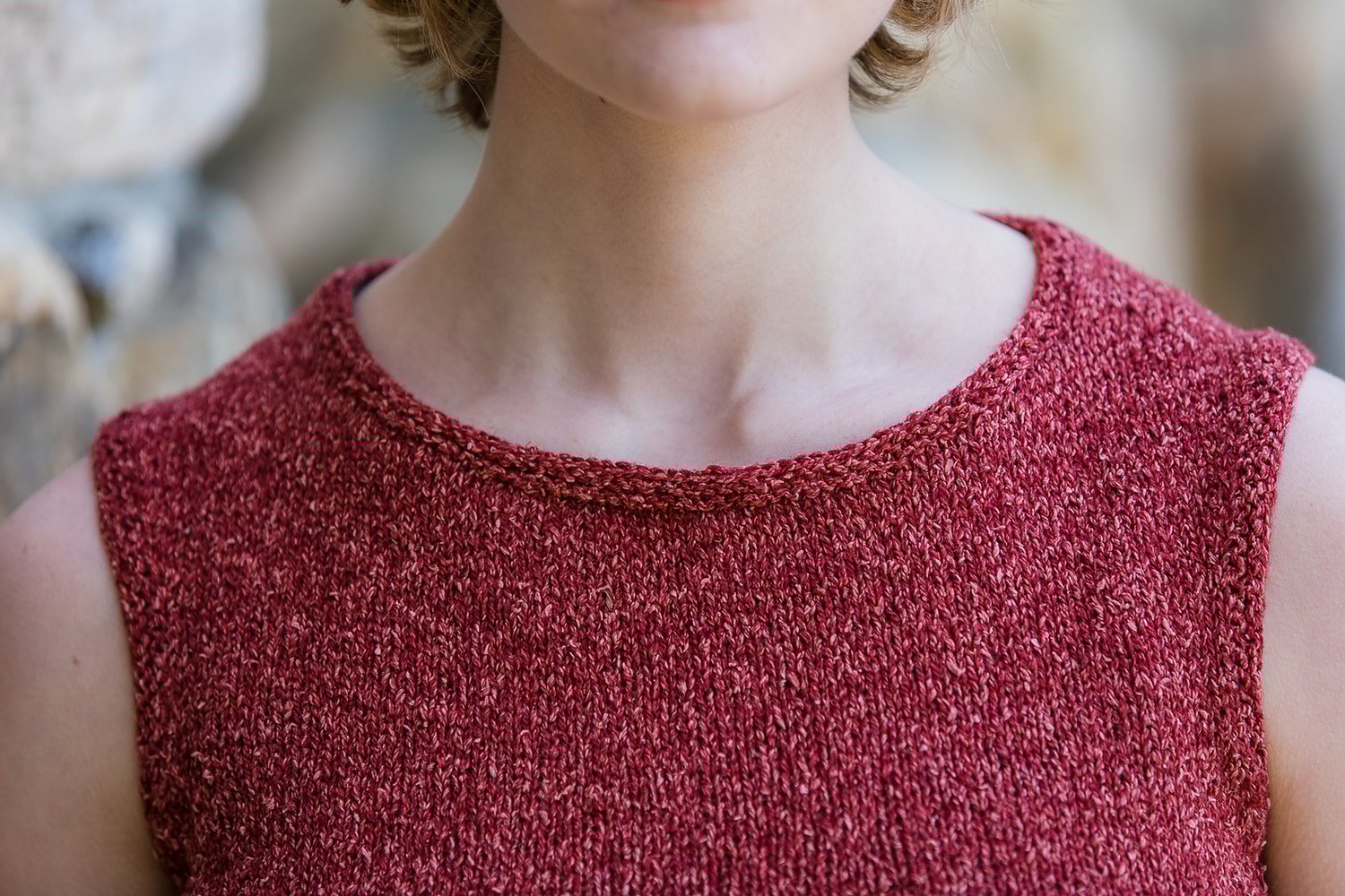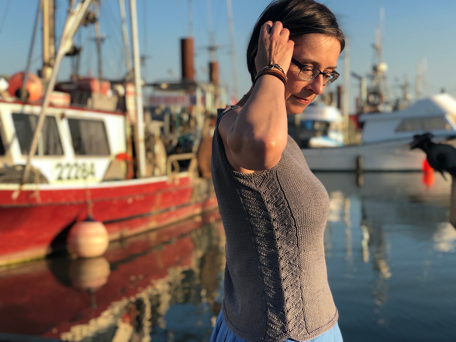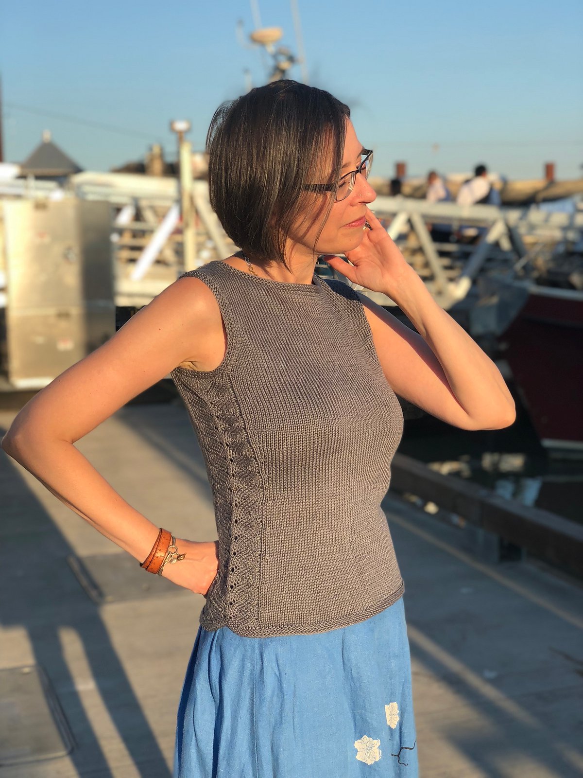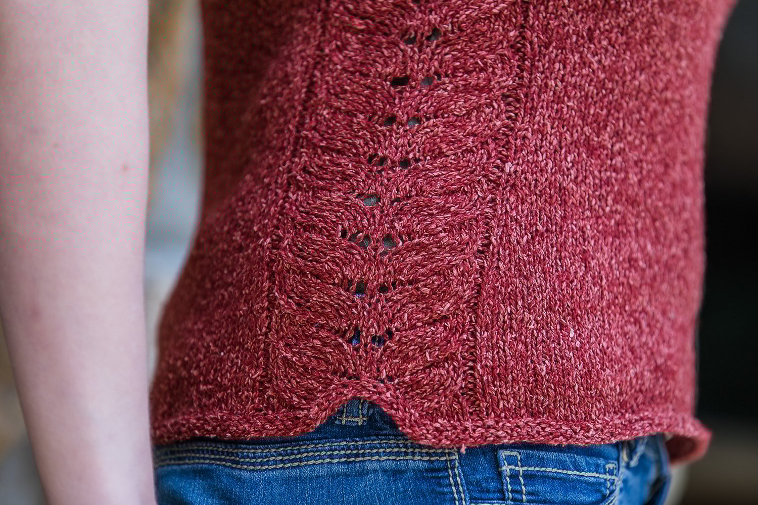 Billhook is a tank top with an elegantly shaped hemline. Intended to be worn with little to no ease, it is worked in the round from the bottom up with waist shaping that is further defined by the Billhook Lace pattern that runs up the sides. The front shoulders wrap around to the back in an English tailored shoulder for a clean fit.