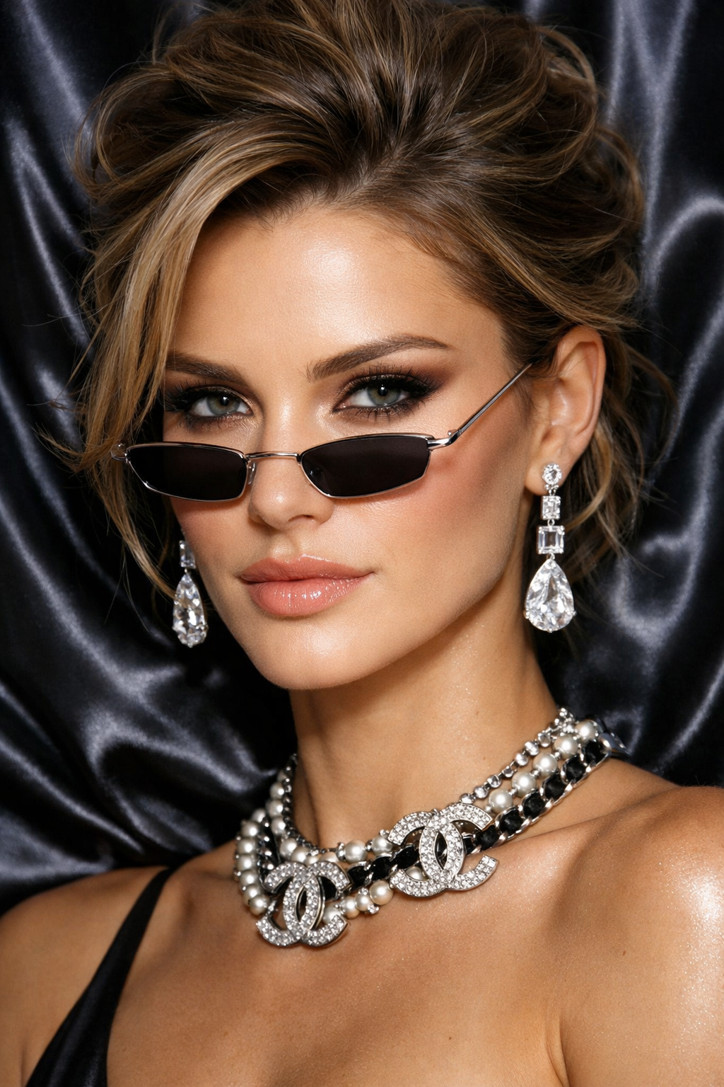 Beauty modeling jewelry and sunglasses.