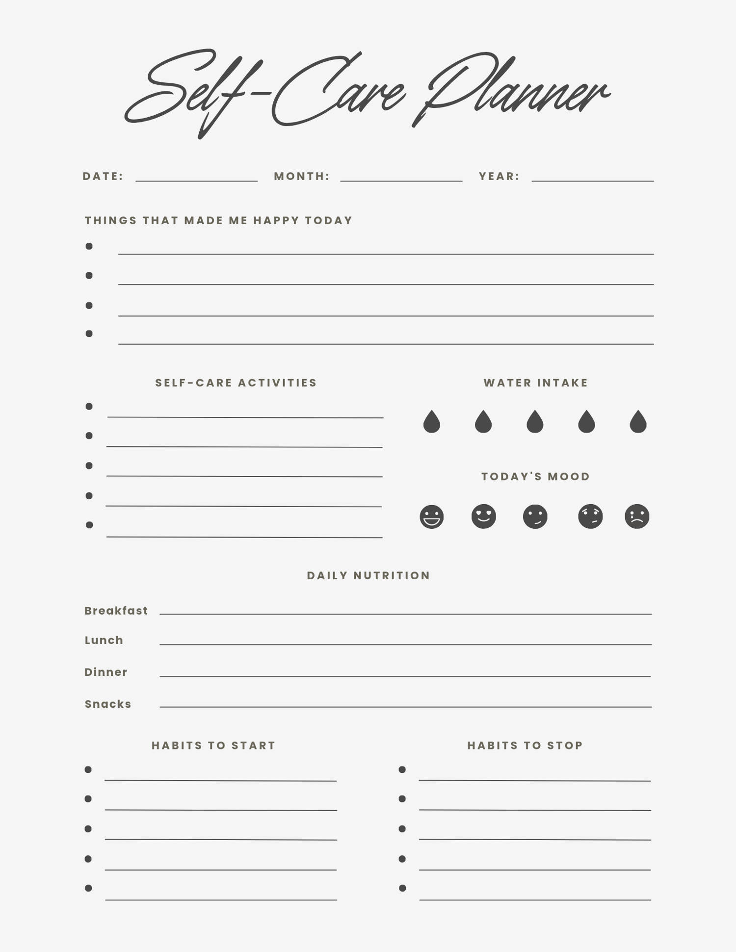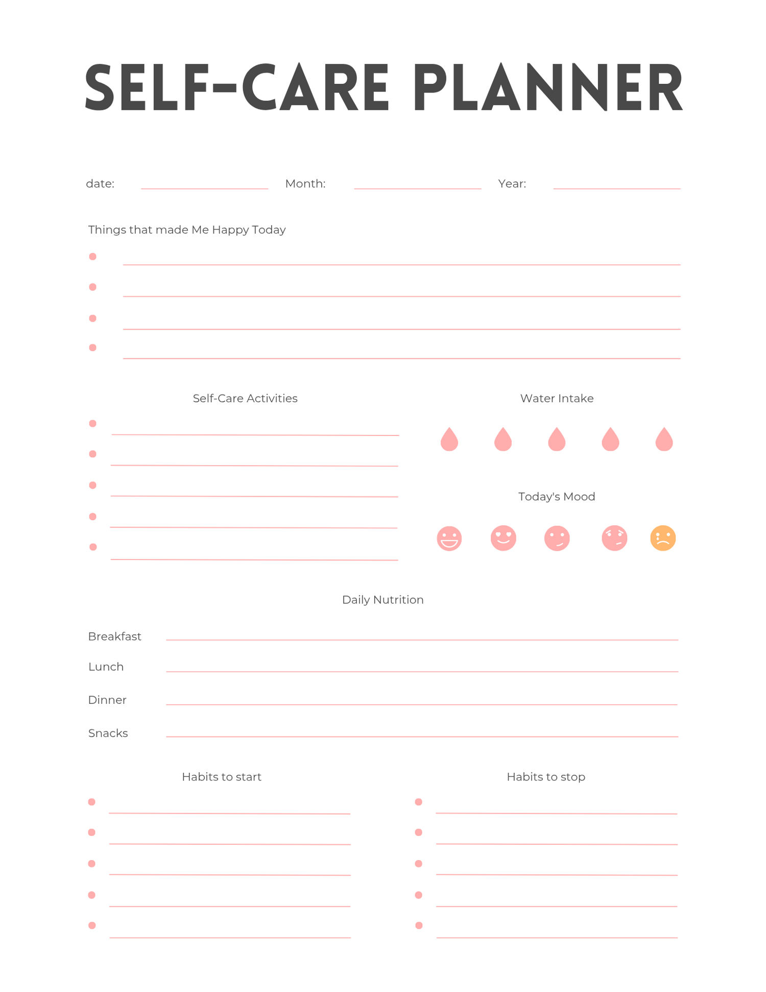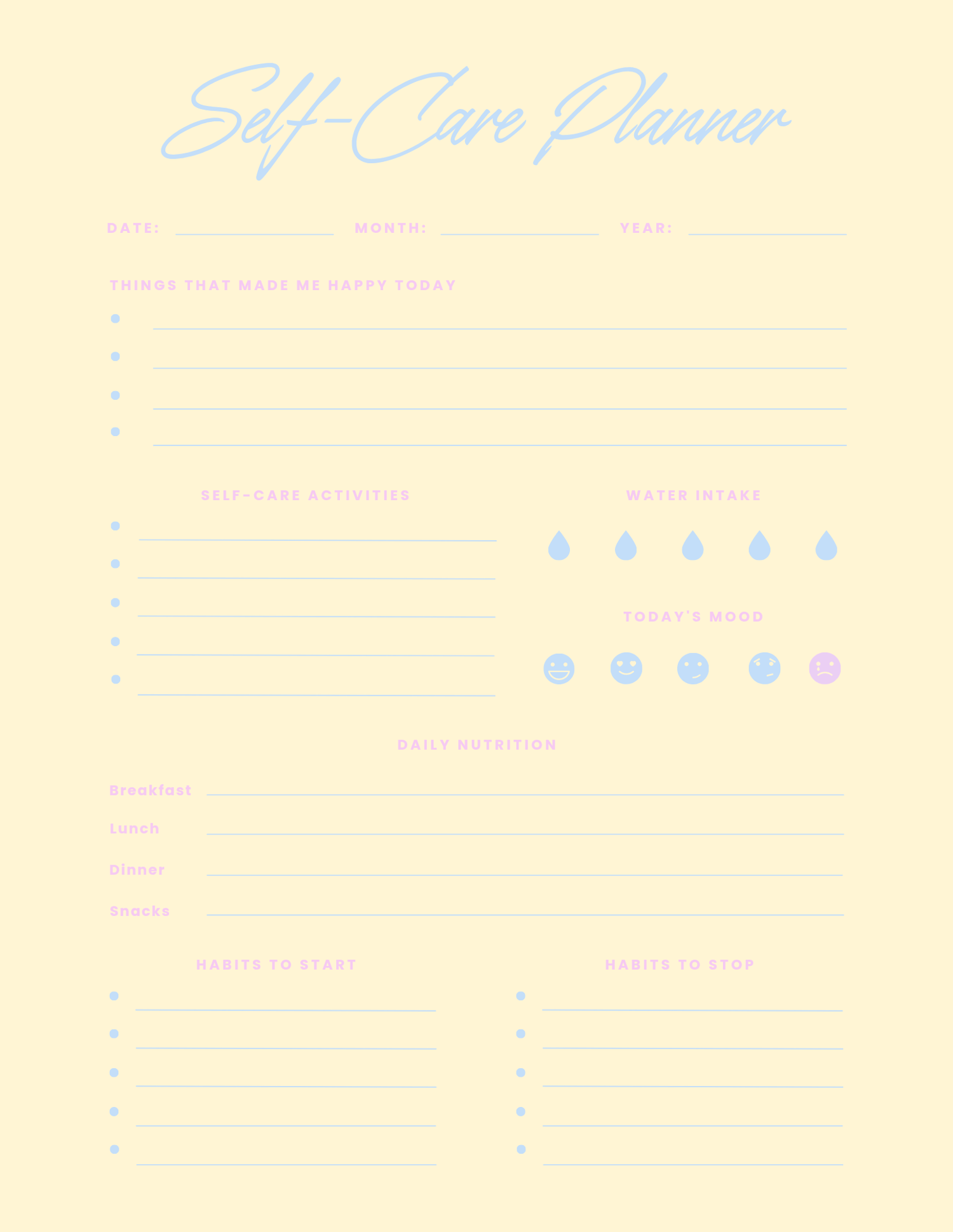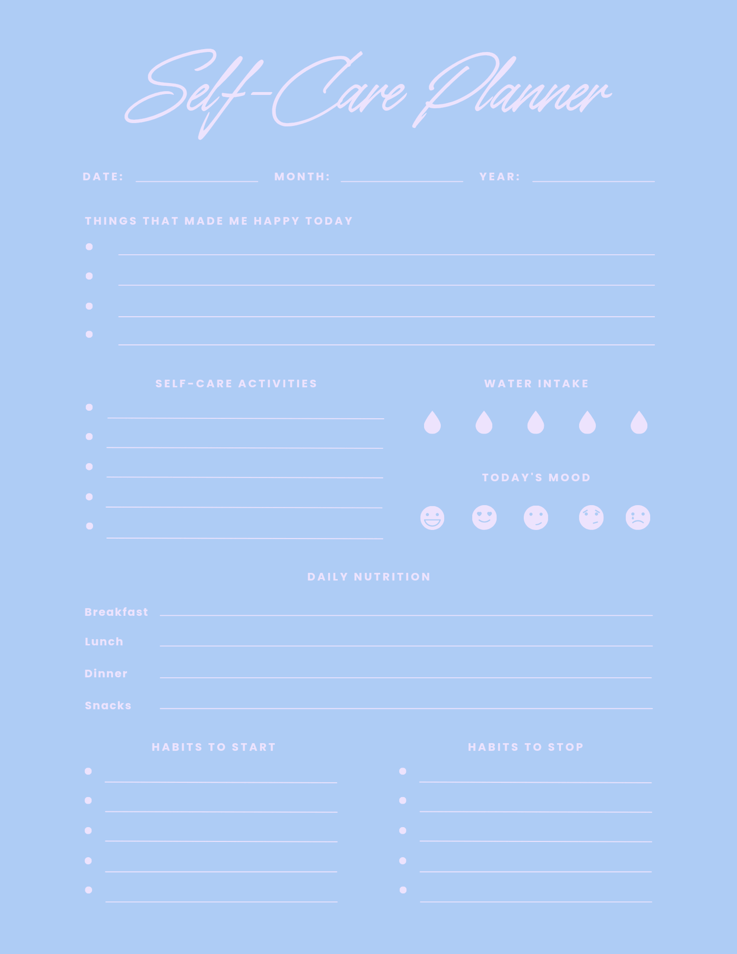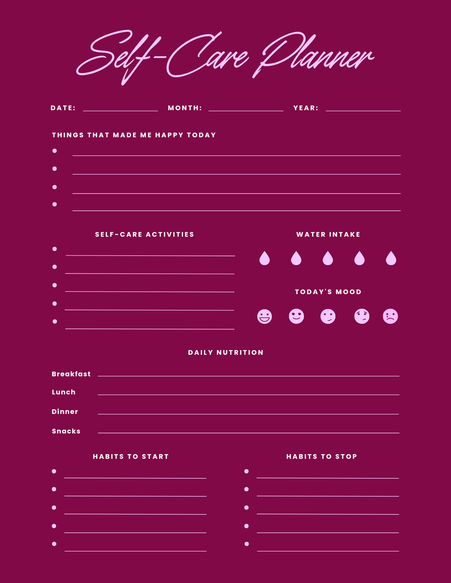 - Daily, weekly, and monthly self-care planning pages