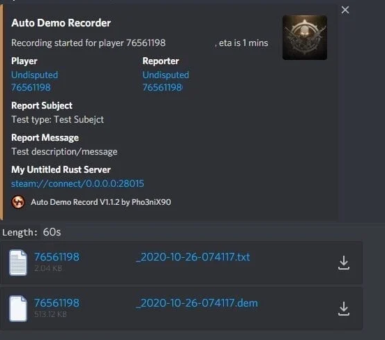 autodemorecord.record [steam64id] [minutes] - Console: Usefull to record a player on demand, or a schedule from another plugin.