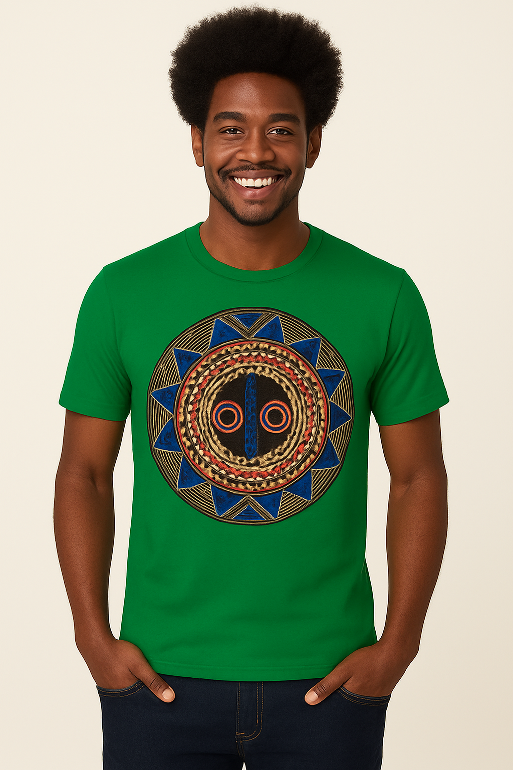 Découvrez un tee-shirt unique issu de l’univers créatif d’Ahmed et les Gombis. Cette pièce met en valeur un logo original inspiré de plusieurs traditions artistiques d’Afrique de l’Ouest et d’Afrique centrale, où les formes circulaires, les couleurs vives et les motifs géométriques sont porteurs de sens.