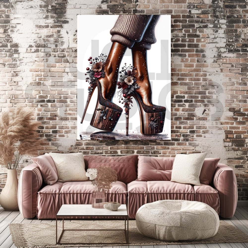 This 18*24-inch work of art captures the essence of high fashion with a touch of fantasy, featuring a pair of luxurious platform stilettos adorned with floral artistry, as if crafted by nature itself. Each heel is a masterpiece, boasting rich, glossy finishes and intricate flower embellishments that seem to bloom directly from the soles, creating a harmonious blend of modern sophistication and timeless elegance. Set against a serene, reflective surface that hints at the glamour of London's winter fashion scene, this poster is a tribute to the craftsmanship and innovative design that define couture. Perfect for fashion aficionados and dreamers alike, let this piece add a note of glamour and surreal beauty to your space.