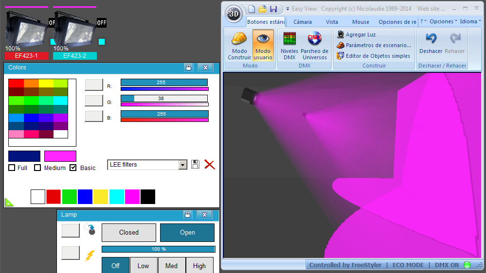 Esta Librería SSL2 está optimizada para trabajar con Magic 3d Easy View. Es decir para ver una representación 3D de las secuencias que estemos realizando con Freestyler, QLC+ o cualquier otro soft que se conecte con Magic 3d.