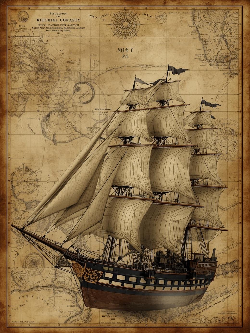 A majestic sailing ship cutting through open waters, set against an antique world map, captures the spirit of adventure, freedom, and timeless discovery.