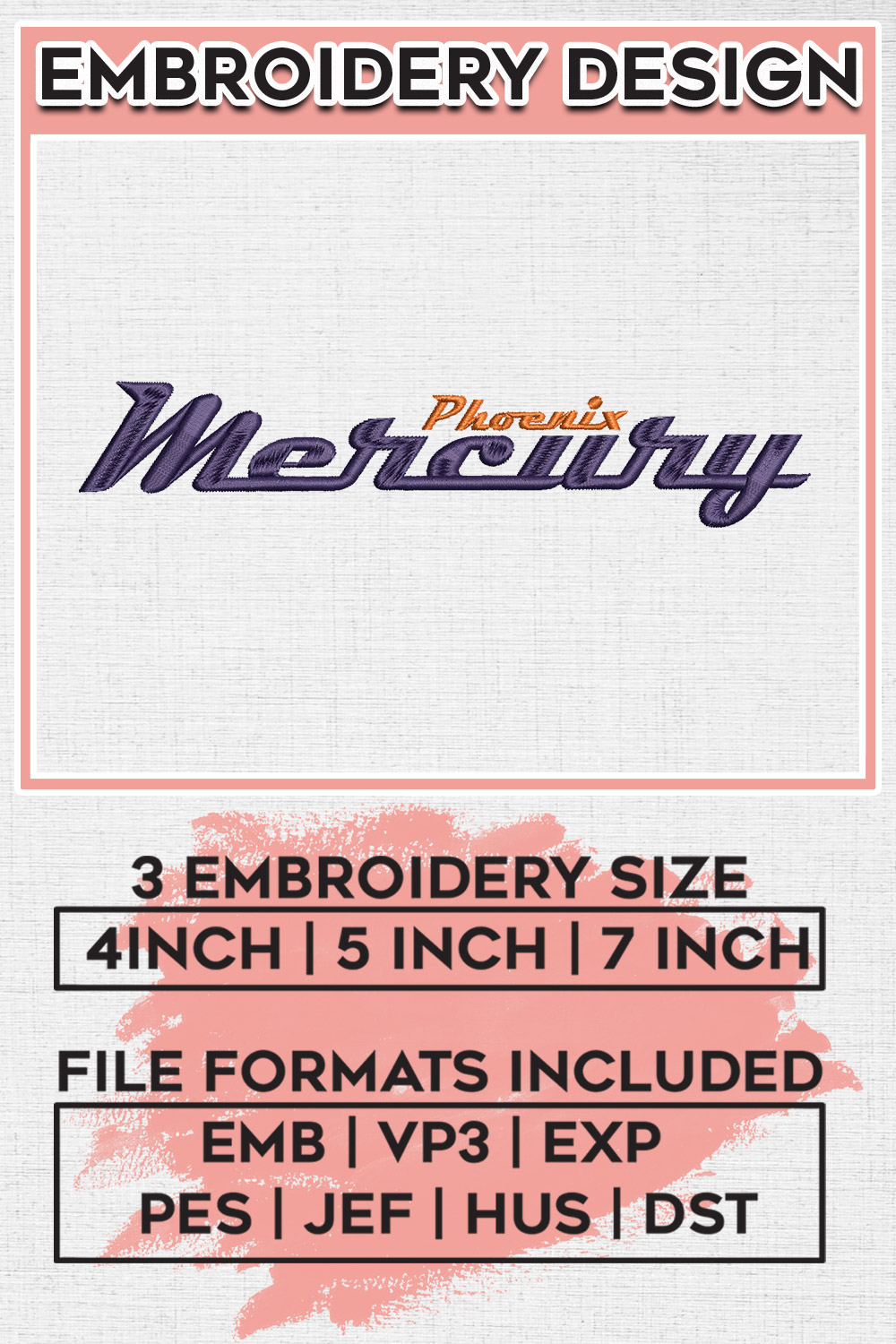 WNBA Phoenix Mercury Basketball Team Writing Logo Embroidery Files, WNBA Phoenix Mercury Team Embroidery Designs, WNBA Basketball Teams, 3 sizes, Machine embroidery designs, Digital Download