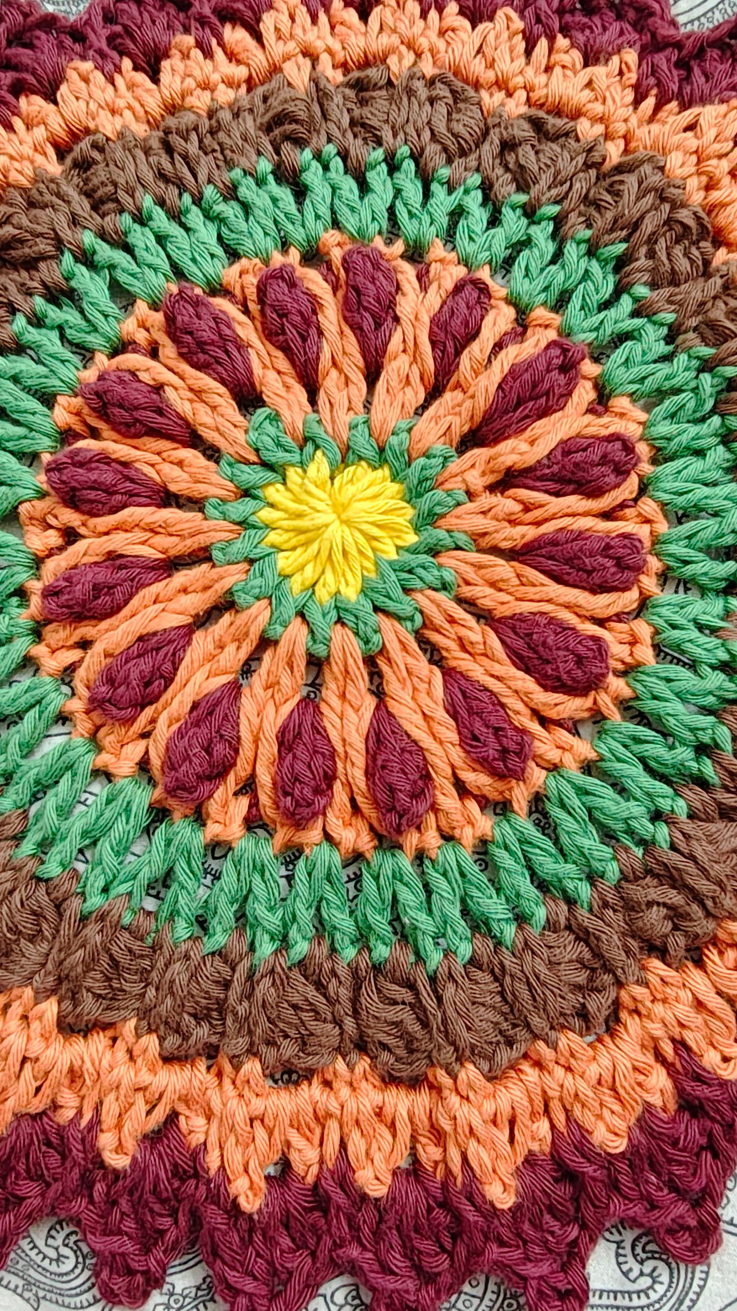 We wanted to use scrap cotton yarn that we have accumulated through the years and this mandala made use of that yarn so beautifully!