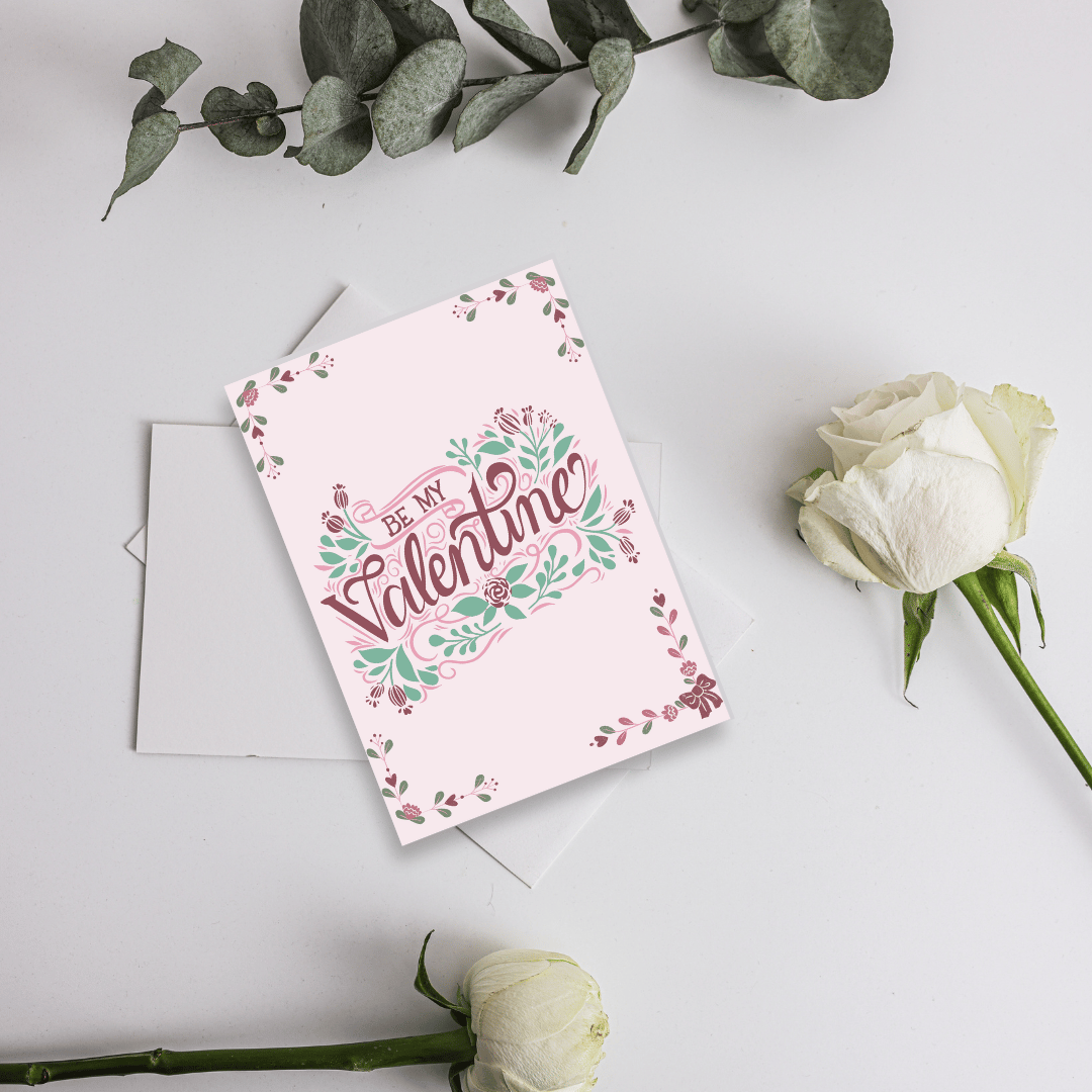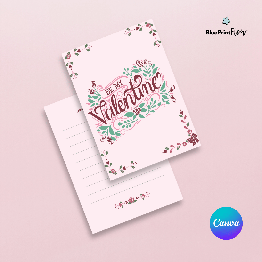 The design features a soft floral pattern with delicate flowers and pastel tones, complemented by stylish lettering that reads "Be My Valentine". The back of the postcard includes space for a heartfelt message, the recipient's address, and a whimsical floral detail to match the front.