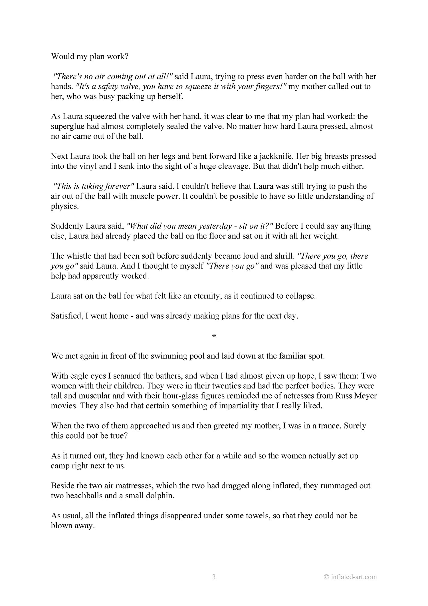 Bored by the careful use of pooltoys by the visitors of a public pool a boy finds a way to manipulate the safety valve to force them to be a little bit more destructive. An approaching storm leaves not much time for the already irritated women getting their inflatables packed up.