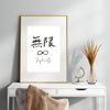 My infinity kanji symbol wall art combines the minimalist elegance of a Japanese kanji for infinity with the iconic infinity symbol and the word "Infinity" in a clean, black and white design. This piece embodies simplicity and the timeless concept of endless possibilities.