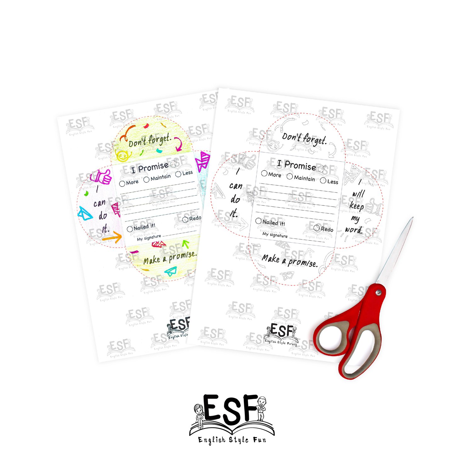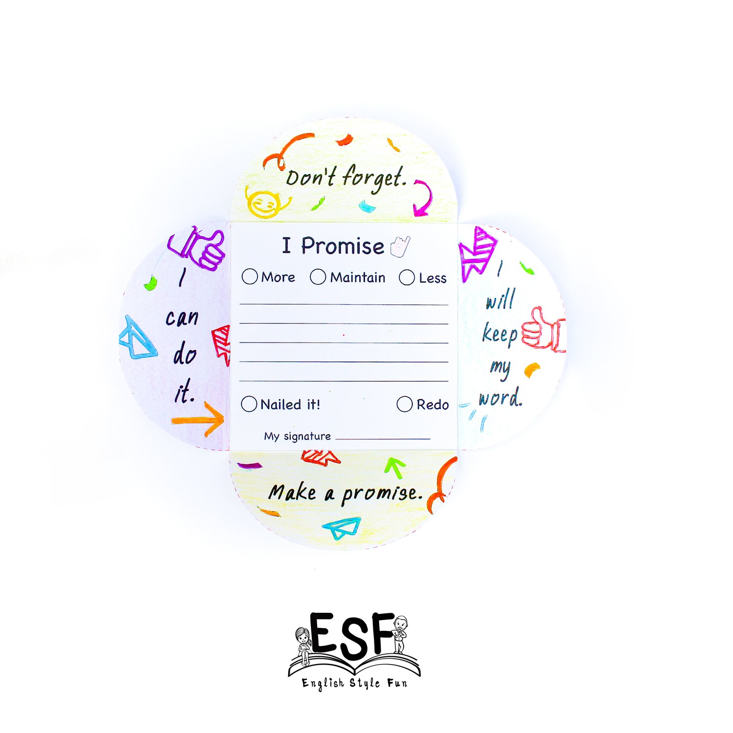 They can write out each of their promises in the provided template, color ( if desired), cut and fold along the provided guide lines, and put it away in a jar (not provided) or a box (not provided), similar to a capsule. This method will help inspire kids and make their “promises” become more memorable. When an appropriate amount of time has passed, they can pull out their promises and check whether or not they have successfully reached their goals.
