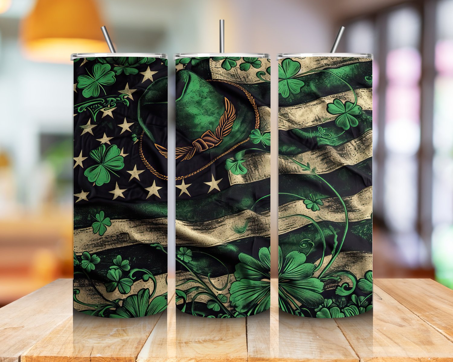 This bold digital artwork blends patriotic pride with St. Patrick’s Day charm, featuring a distressed American flag reimagined in rich shades of green and vintage ivory. Flowing fabric textures create depth and movement, while scattered four-leaf clovers weave through the design to symbolize luck, heritage, and celebration. A classic green cowboy hat with gold detailing rests prominently at the center, adding a rustic Americana feel with a festive Irish twist.