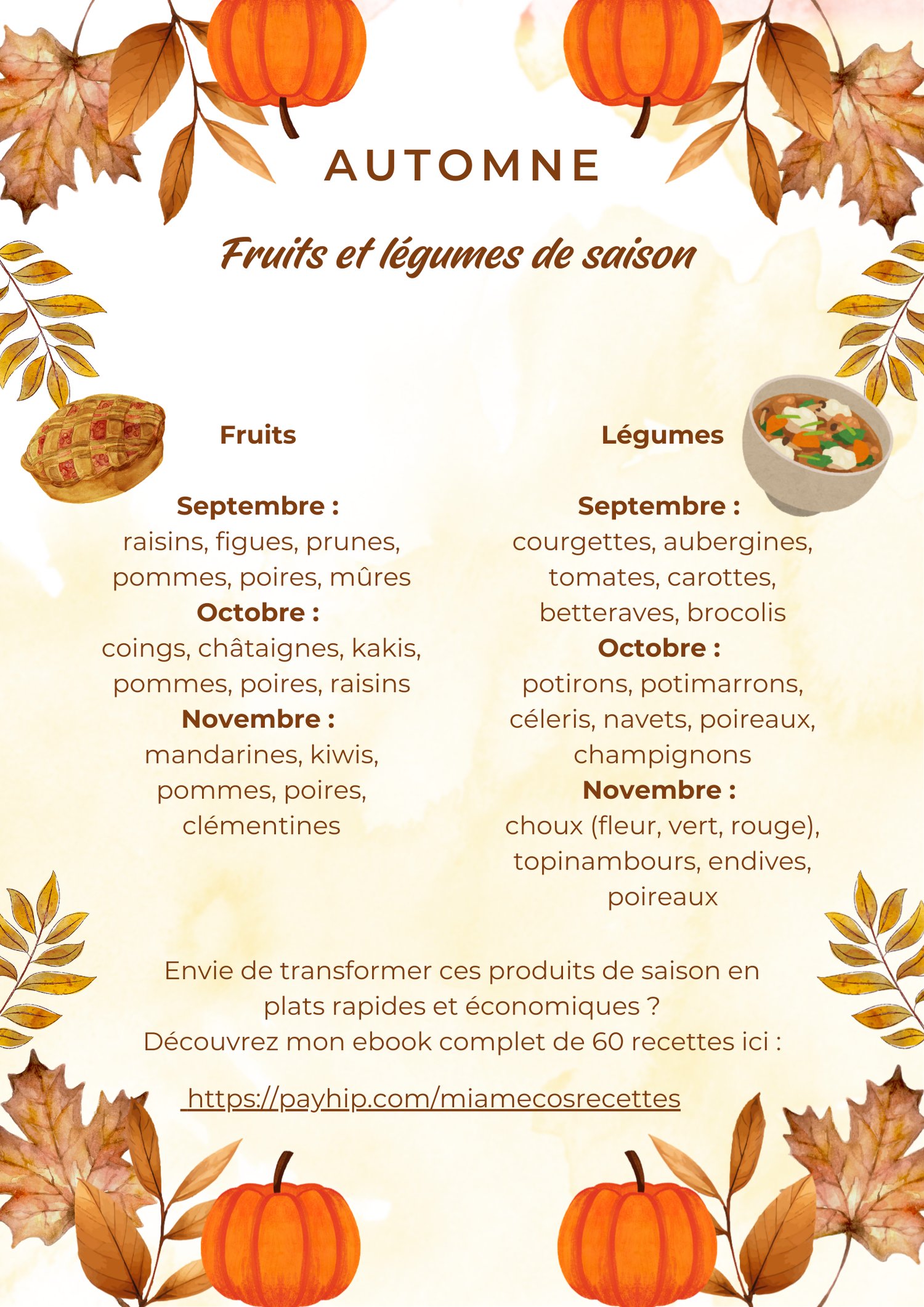 Découvrez l'essentiel pour préparer des repas de saison avec notre fiche pratique. De la courge au potimarron, en passant par les pommes et les poires, cette liste est votre guide simple et rapide pour faire le plein de saveurs d'automne. Téléchargez-la maintenant et simplifiez vos courses !