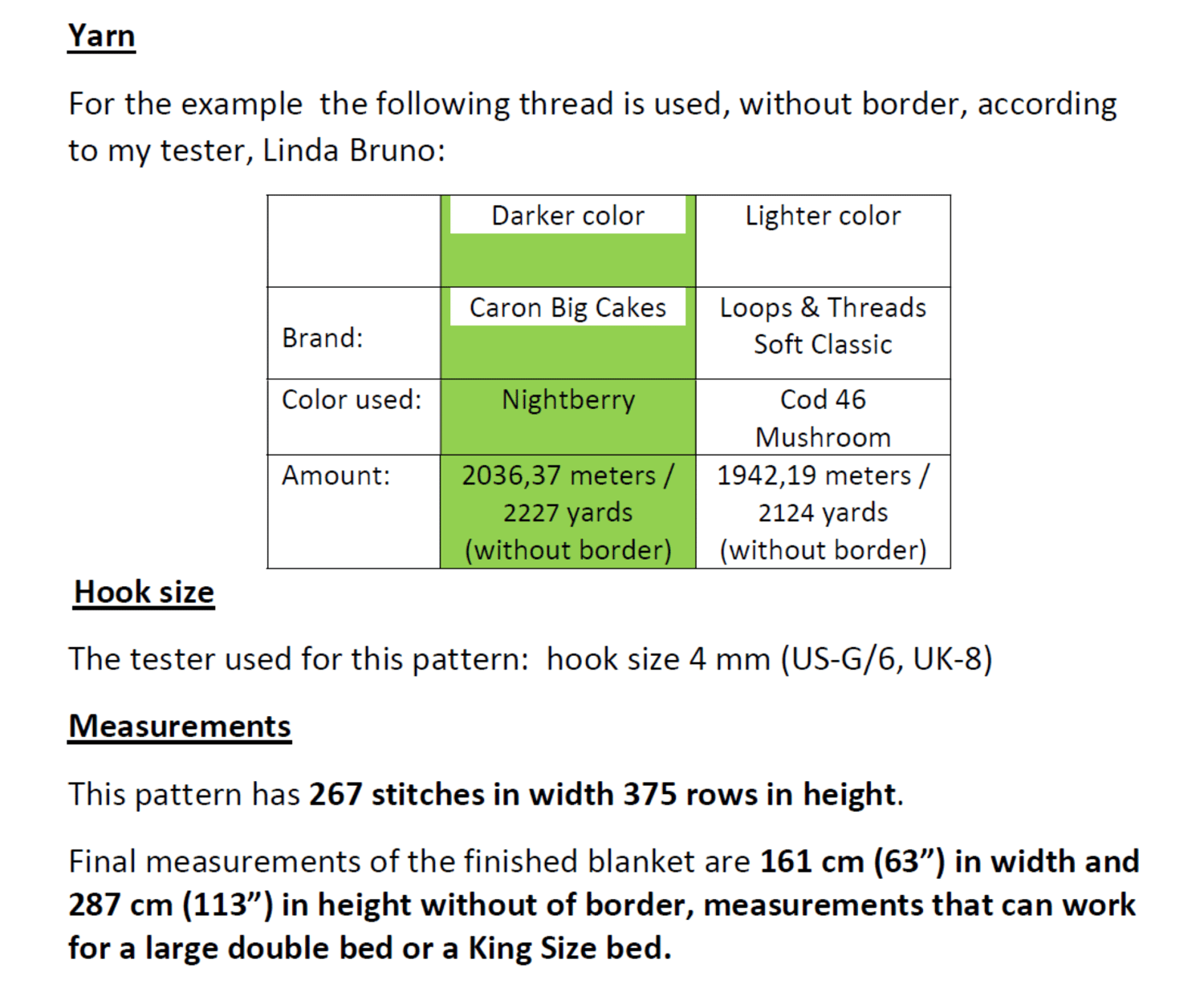 The amount of yarn used for this pattern by my tester without the border was: 2036,37 meters / 2227 yards (colour Nightberry of brand Caron Big Cakes) and 1942,19 meters / 2124 yards (colour Cod 46 Mushroom of brand Loops & Threads Soft Classic)