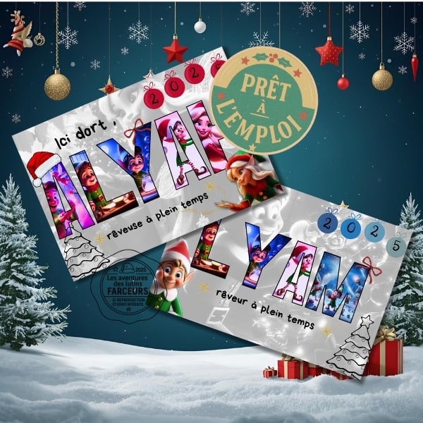 Design enchanteur : Chaque lettre du prénom est peuplée de lutins de la Gazette du Pôle Nord 2025. Le message “rêveur·se à plein temps” invite à la tendresse et à l’imaginaire.