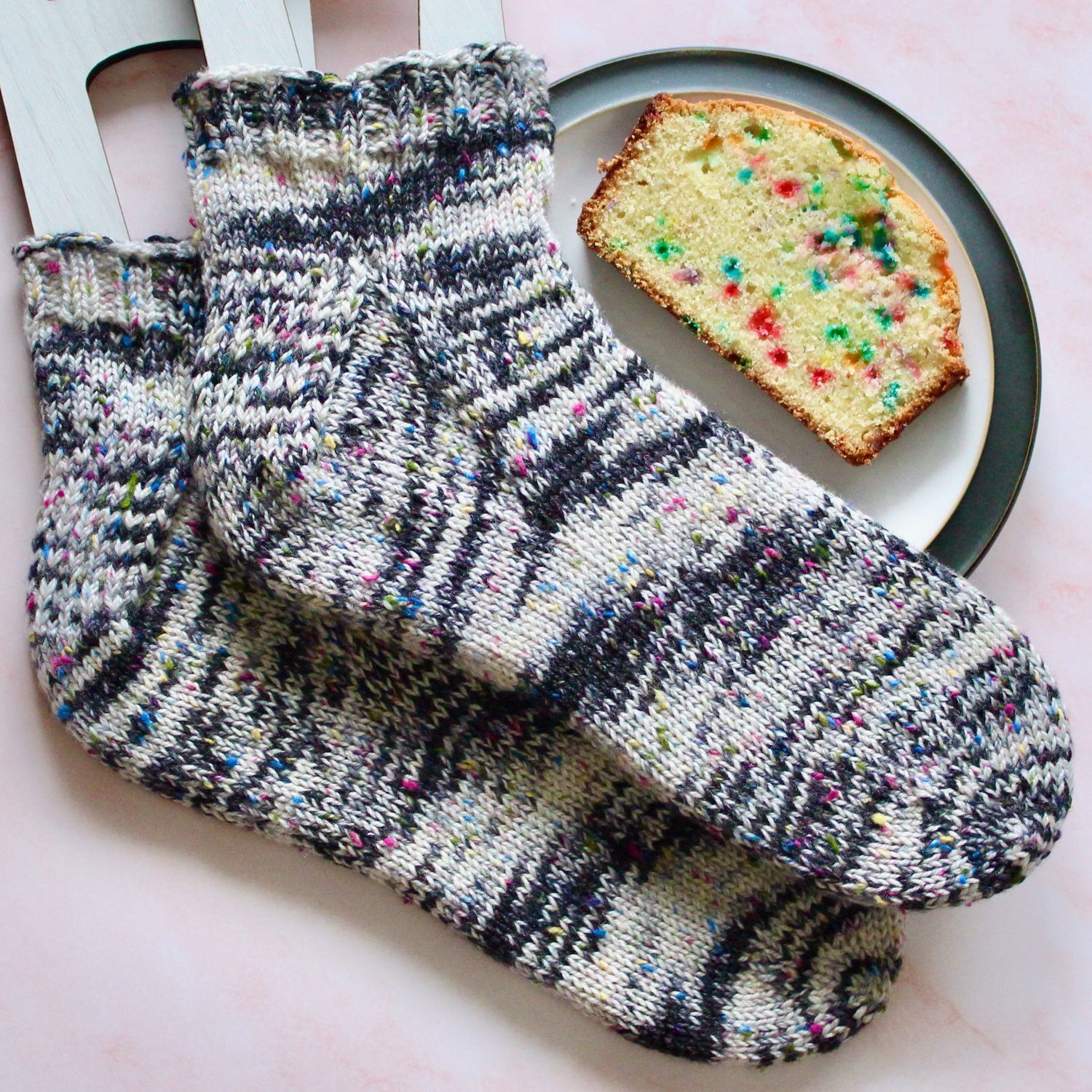 The Vanilla Bean Pound Cake Socks are inspired by one of my other creative loves: baking! I love the flavour of vanilla bean a lot, so I also love this fabulous and simple recipe from a baking blogger I’ve been following for many years. But who can resist also adding a rainbow flair to the batter? I definitely can’t, so I often gently stir in an embarrassingly-large amount of sprinkles at the last minute before they go in the oven as well. Why not?