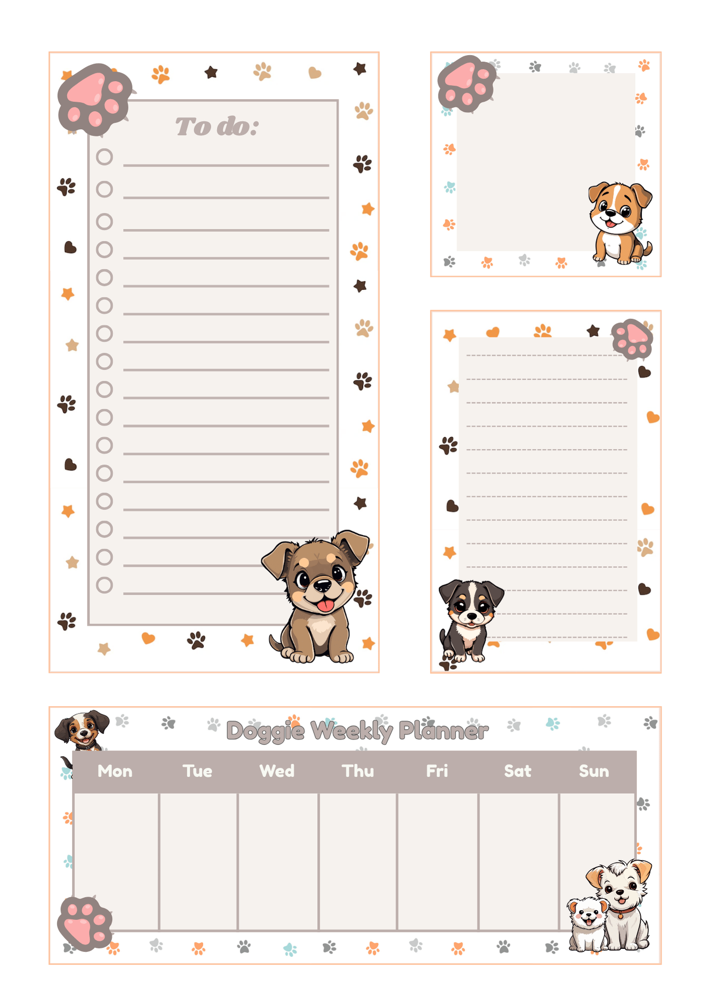 This is a four-piece stationery set, including a To-Do List, Memo Pad, Notepad, and Weekly Planner, all featuring a firewood brown color palette. Each item showcases pictures of dogs and has a repeating background pattern of little printed paw prints used as a border on every sheet.