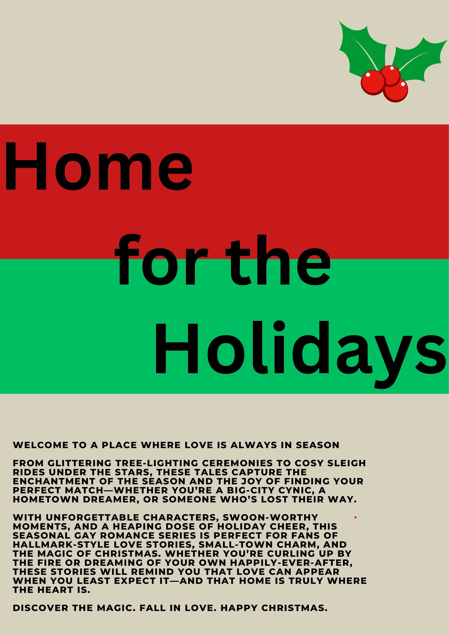 With unforgettable characters, swoon-worthy moments, and a heaping dose of holiday cheer, this seasonal gay romance series is perfect for fans of Hallmark-style love stories, small-town charm, and the magic of Christmas. Whether you’re curling up by the fire or dreaming of your own happily-ever-after, these stories will remind you that love can appear when you least expect it—and that home is truly where the heart is.