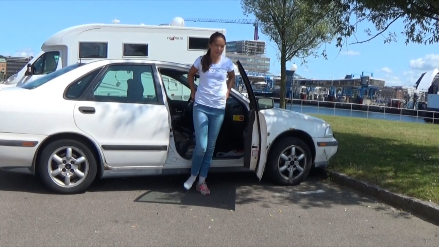 Castgirl begins to crutch from the end of the pier and she sometimes tries to walk on tiptoe on her injured sock foot.She stops to watch the ferries pass through the harbor before continuing on towards a work of art.This is a great clip with both crutching and tiptoe walk.