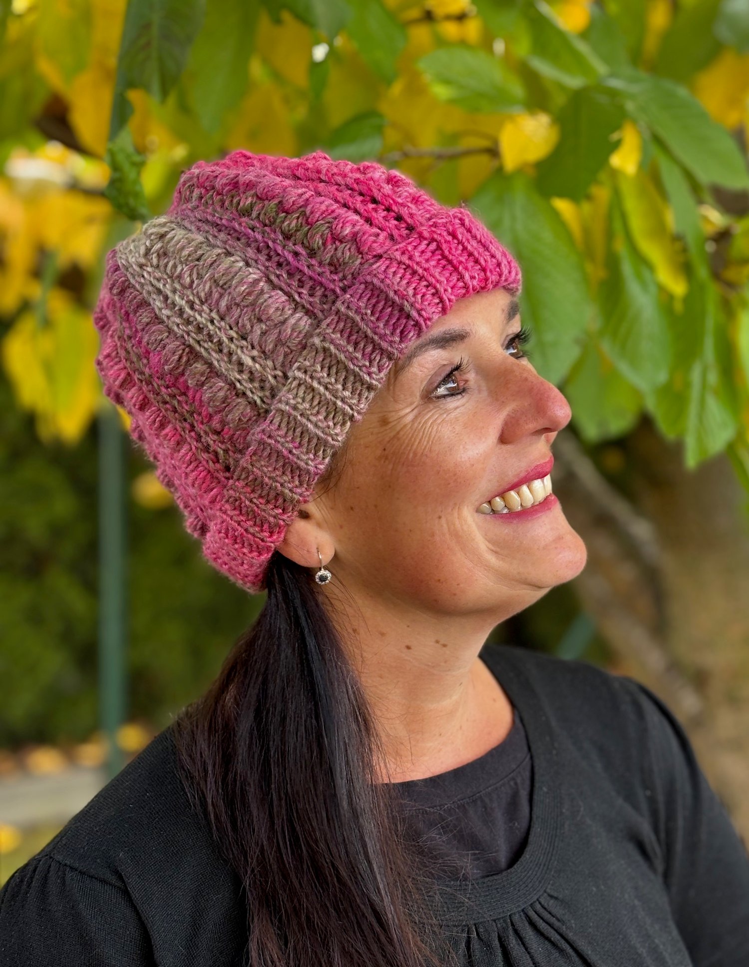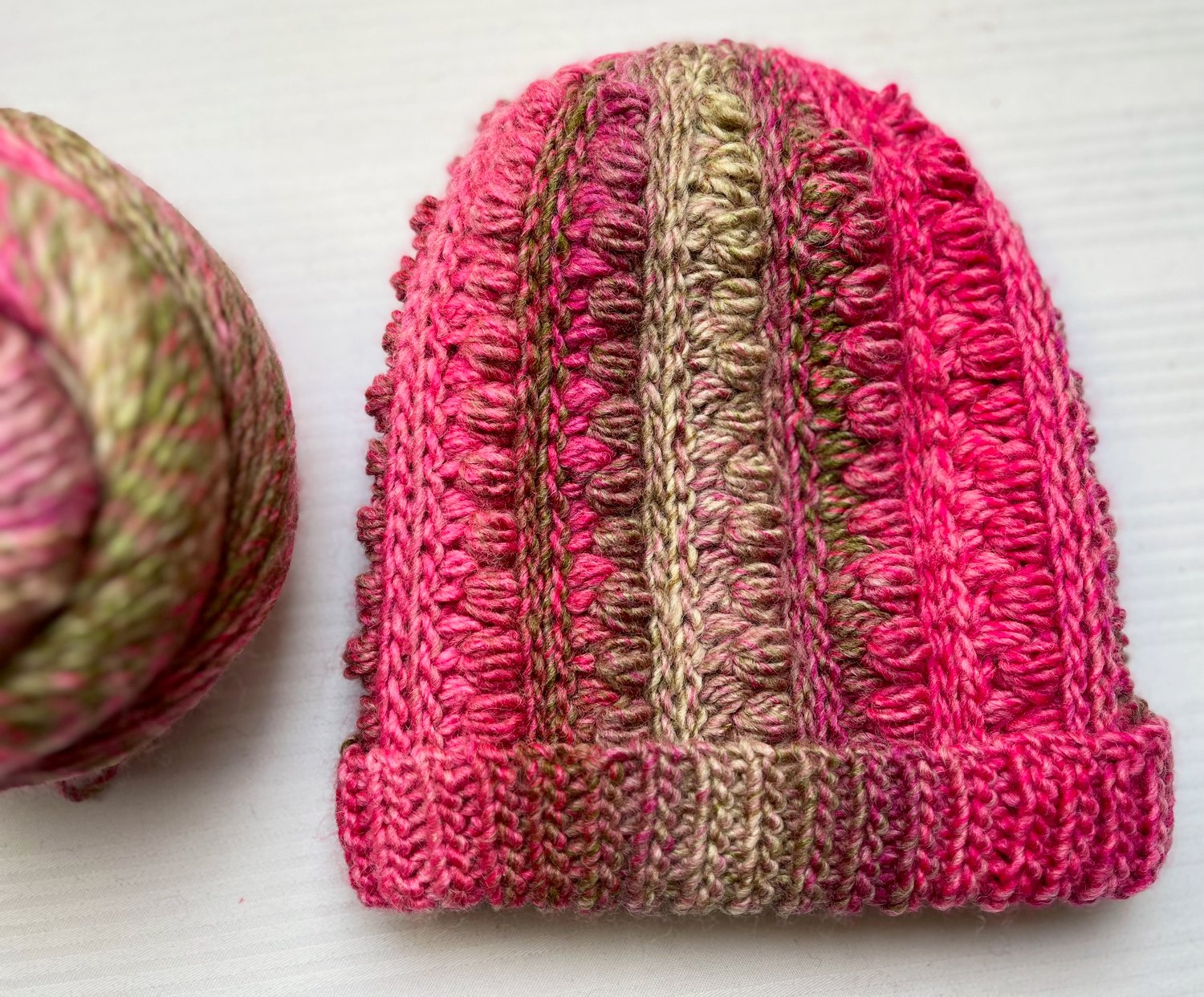 The hat features a distinct textured stitch pattern created by alternating ribbing and eye-catching puff stitches. This structure delivers a beautiful dimensional fabric and ensures the hat is comfortably warm, stretchy, and not heavy or overly dense.