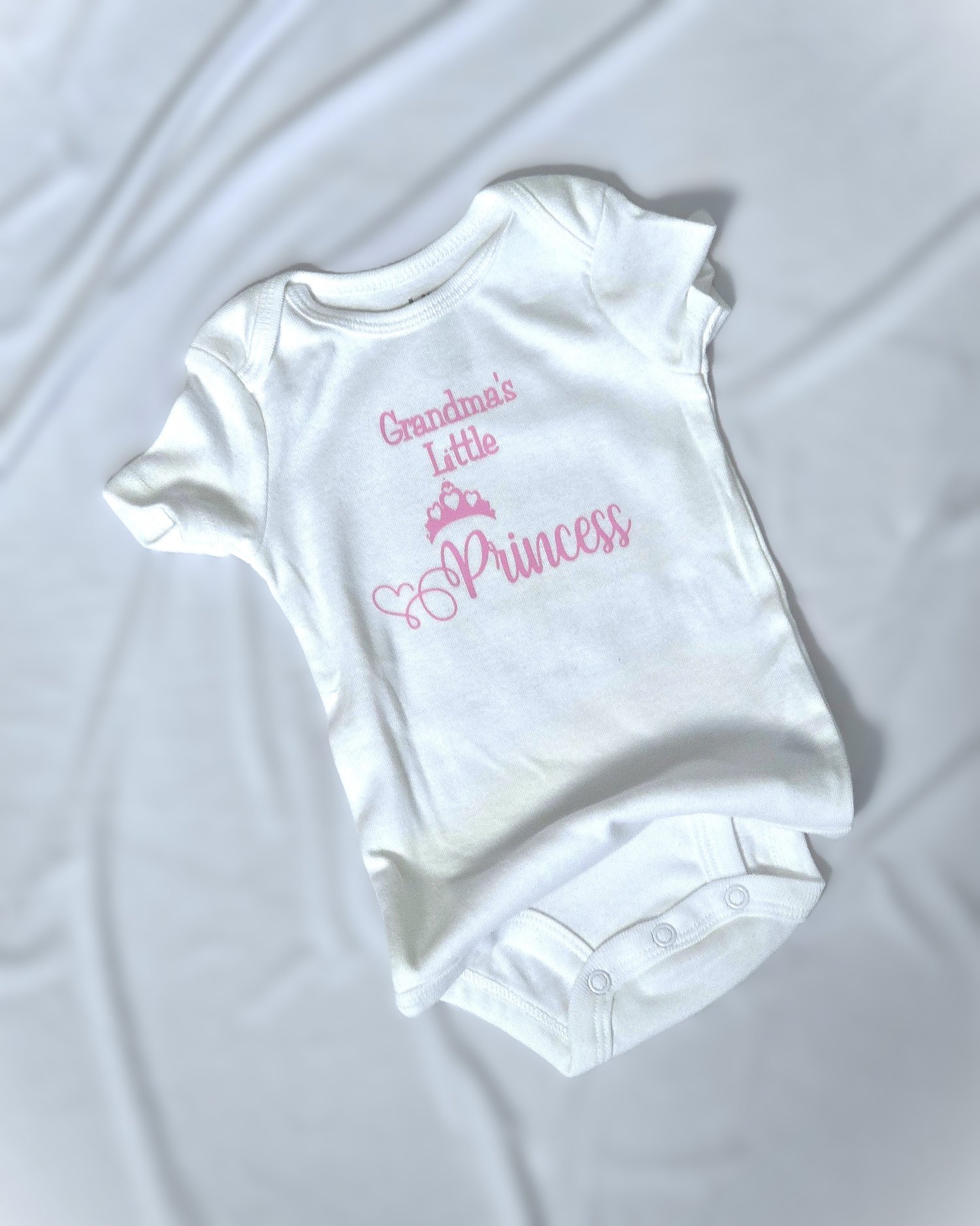 Grandma Little Princess, Cute Bodysuit, Grandma Loves Me. This cute baby bodysuit is a great gift for new moms. Onesie comes in WHITE with your vinyl color choice design and short sleeves. Makes a wonderful gift for newborns, babies and toddlers!