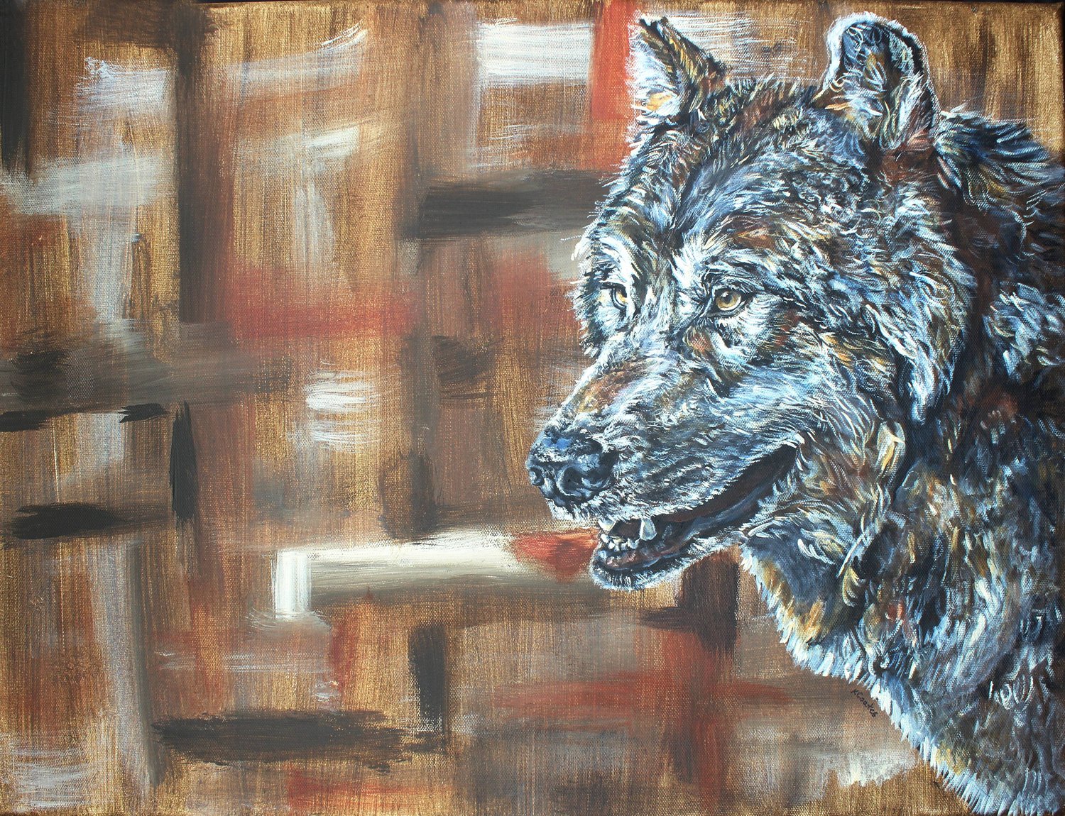 In shades of brown and structured lines, the wolf's gaze whispers of strength, wildness and echoes the quietness of earth.