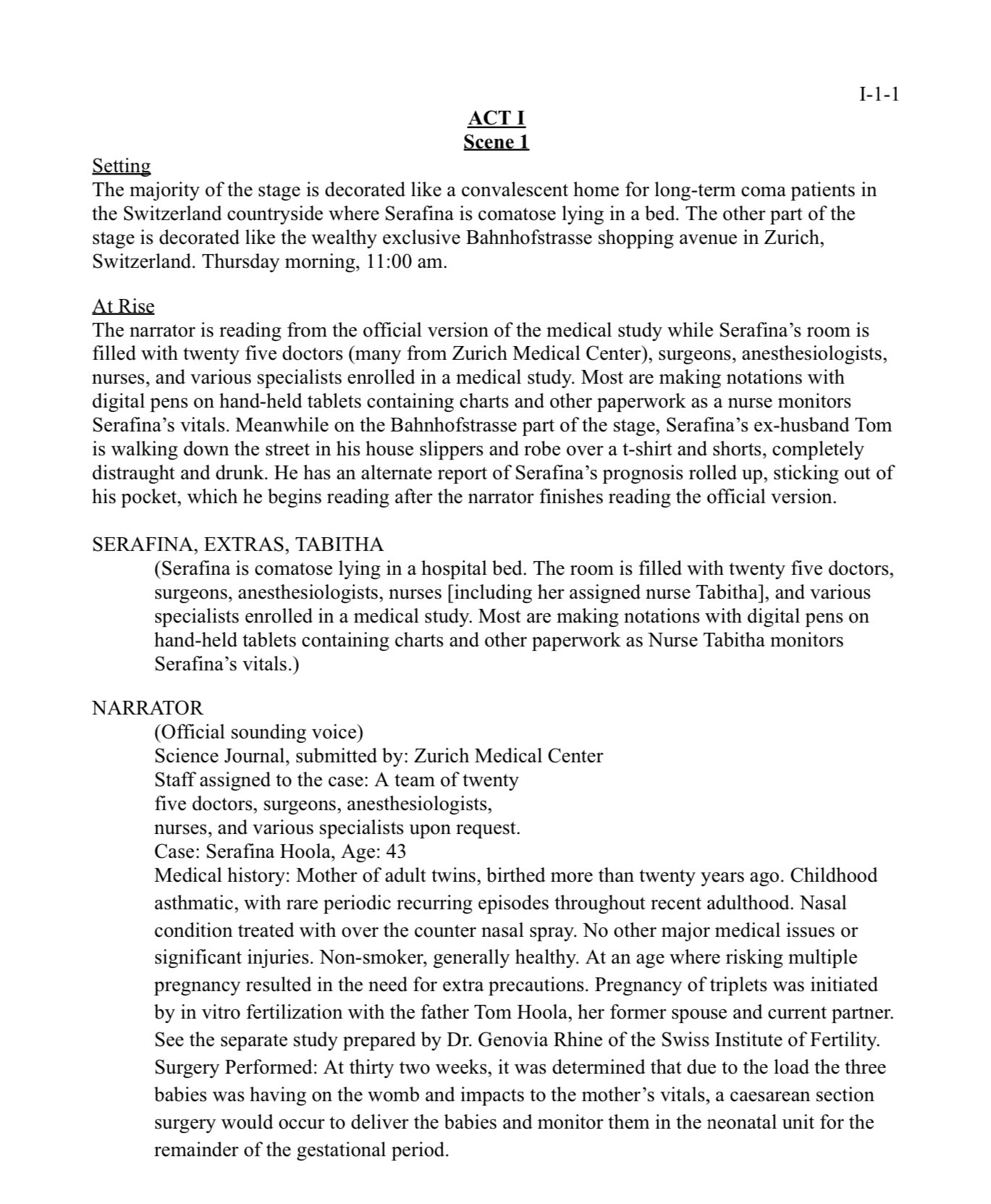 This is the 3 Act Play from Tom and Serafina, the second book of the series Worth Avenue: Palm Beach Ballerina Adventures (Also see the spinoff book Steven and the Sensei). Intense scenes with an aging art forger thief in a sanitarium, a leading character in a coma or playing a deceased spirit, and a treehouse incident amongst the new twin triplet brothers. Explores the time that Tom and Serafina spend in and around Switzerland during her billionaire husband Pierre Dubois’ death, inquest, and beyond including back in Palm Beach, Florida. Serafina's husband has just unexpectedly died after she discovered he and his uncle had been forging Monet and other paintings to amass their sizable wealth. Tom rushes to her side thinking she has fallen off a mountain skiing, as she hadn’t been returning calls or texts from their daughters Holly and Holland, or the Palm Beach police chief Scottie who is engaged to Holly. Seeing as his uncle is confined to a sanitarium due to having gone mad, insisting on confessing in an old Romanian scripted garbled scrawl, Serafina is one of only a few who really know what Pierre is up to. The story picks up at the inquest months later, with flashbacks to events occurring at the time of his death. Riveting and a thoroughly enjoyable journey that will keep the audience captivated from start to finish.