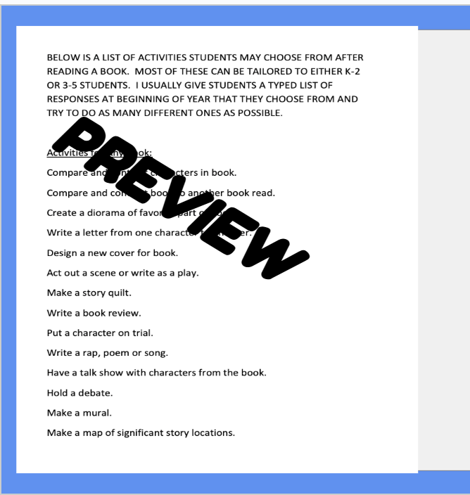 Here is a brief description of a list of activities that can be used for any book as reading responses throughout the year: