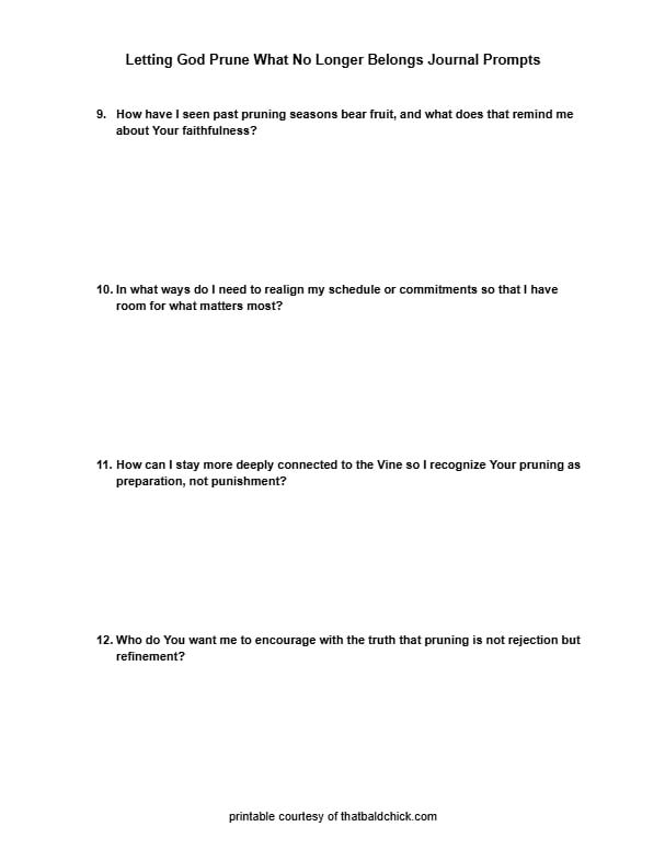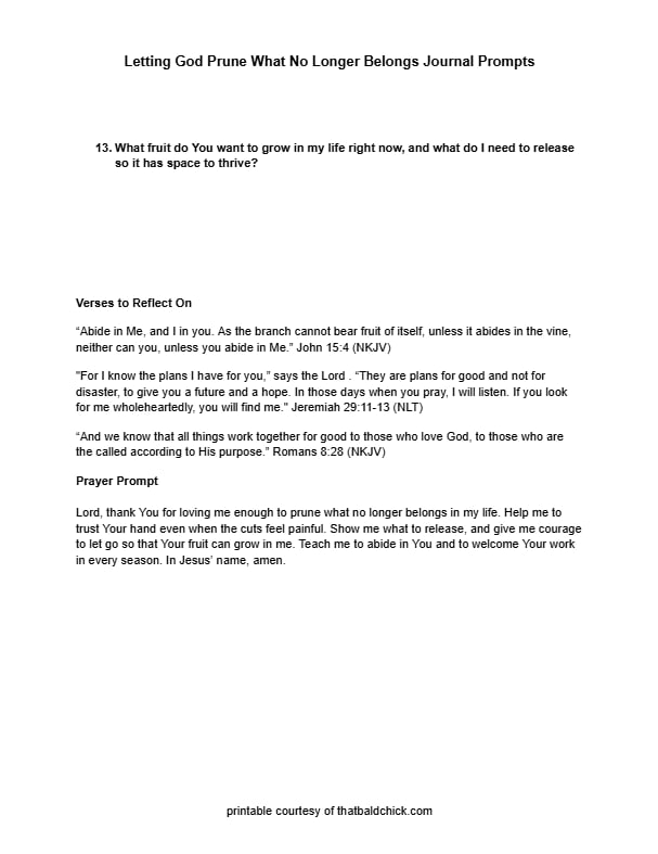 These journal pages are designed for reflection, prayer, and soul-growth. They are centered around letting God prune what no longer belongs in your life, with space built in to think deeply, write openly, and rest in His presence. The questions thoughtfully walk you through considering what areas the Lord may be trimming or pruning in your life to promote growth in, how you might have been resisting it, and how you can lean into it more. The Verses to Reflect On serve as reminders where we draw our strength and purpose. The guided prayer prompt helps to surrender to the pruning process, recognizing that God's plan is to give you a hope and a future.