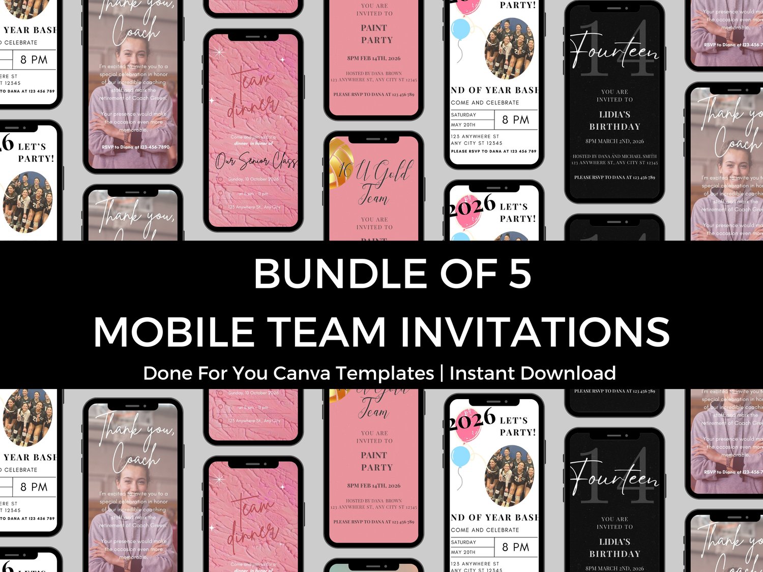 You’ll receive 5 editable Canva invitation templates, designed specifically for mobile sharing: