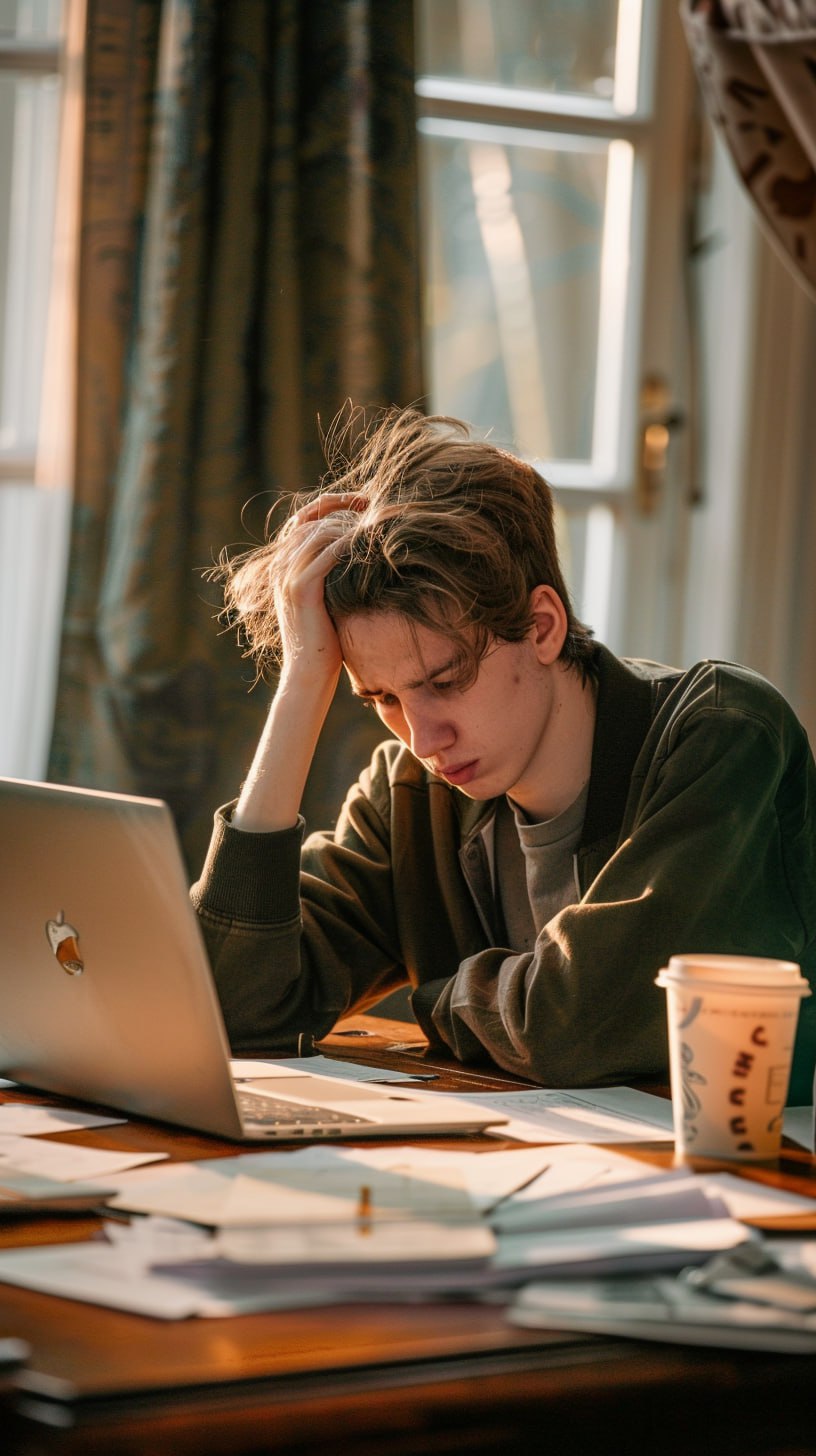 Capture the raw emotion of a long workday with this realistic, high-impact portrait. A young adult sits at a cluttered desk, holding their head in frustration, surrounded by papers, a laptop, and a coffee cup, evoking the stress and exhaustion of modern life. Soft, neutral lighting enhances the authenticity, creating a visually compelling scene perfect for storytellers, digital artists, and creators seeking relatable, professional-quality imagery. Turn everyday struggles into striking, memorable visuals that resonate instantly.