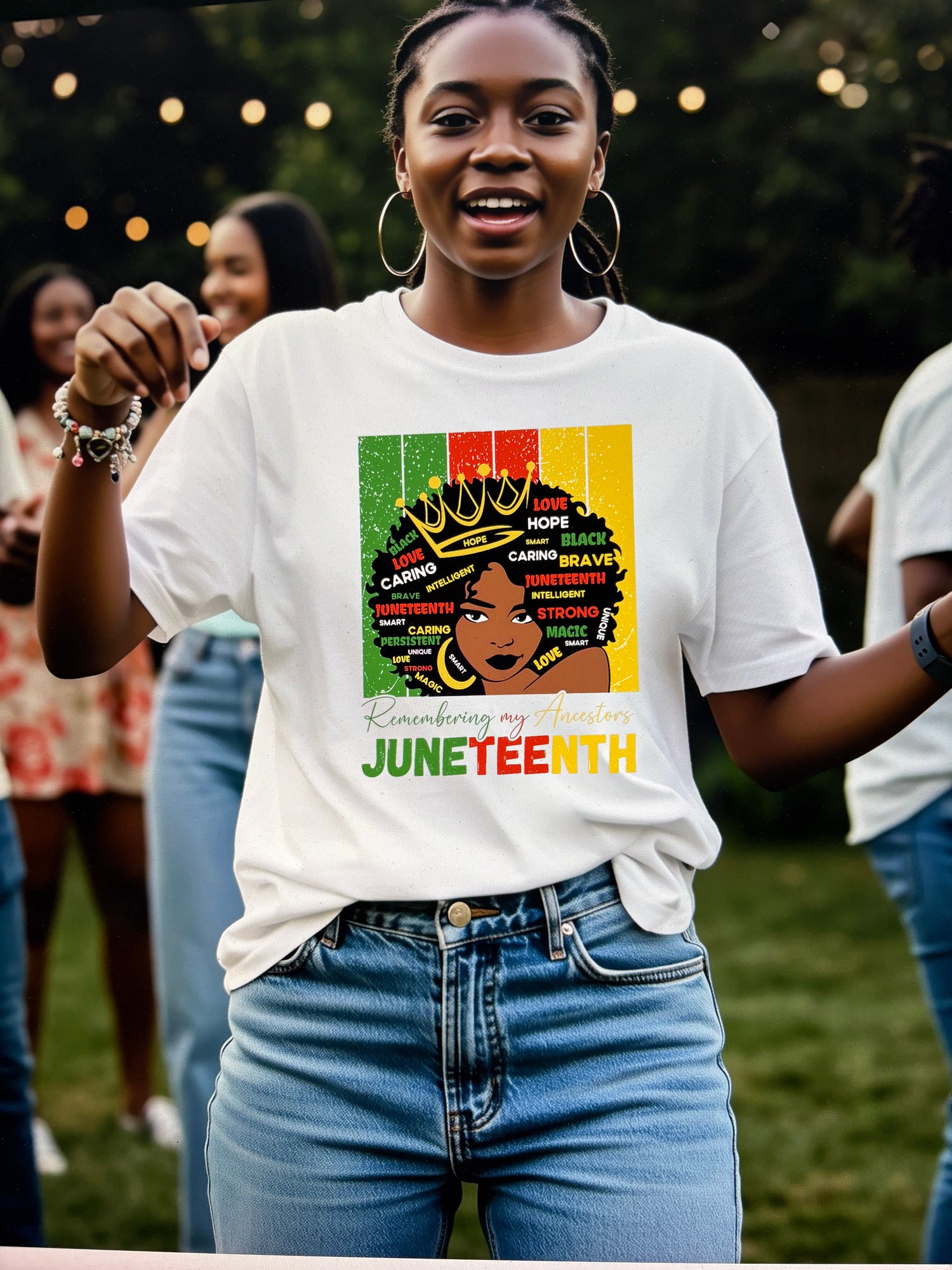 Celebrate freedom, culture, and legacy in style. This vibrant tee features an Afrocentric crowned design with powerful words like Strong, Brave, Hope, and Juneteenth woven into the graphic.