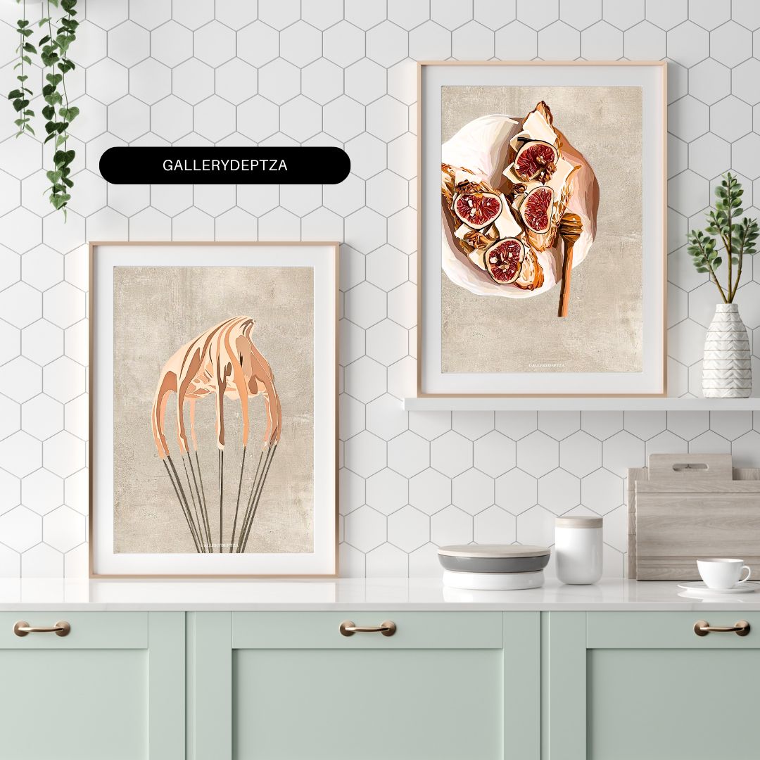 Modern Kitchen Wall Art – Whisk & Toast with Figs Poster Set | Neutral Aesthetic Digital Download | A4 & A3 PDF Bundle of 2