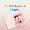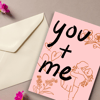 This editable postcard template features a cute and floral design that is perfect for 14th February. The front side says "you + me" in bold, charming lettering surrounded by delicate floral illustrations, capturing the essence of love and connection. The back side offers a lined section with elegant sketches, such as a butterfly and holding hands, giving you space to write a heartfelt message to your boyfriend, girlfriend, or someone special.