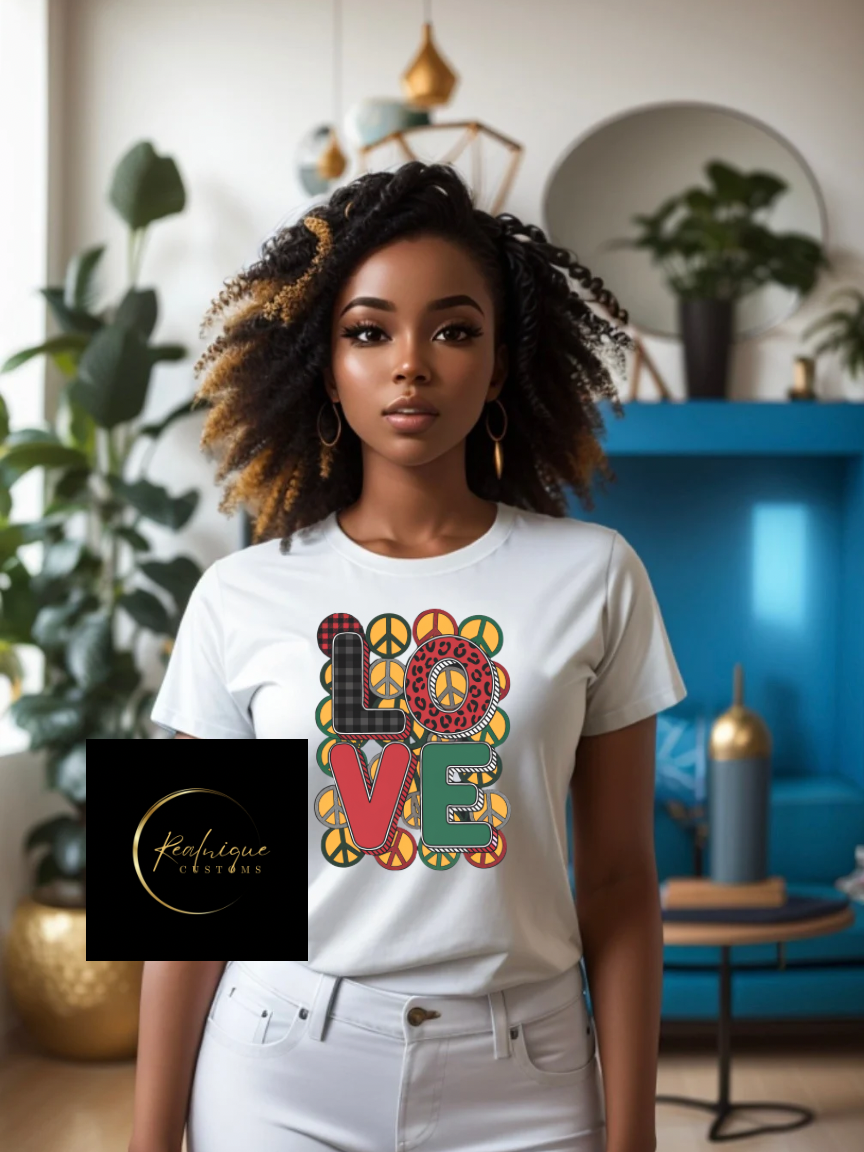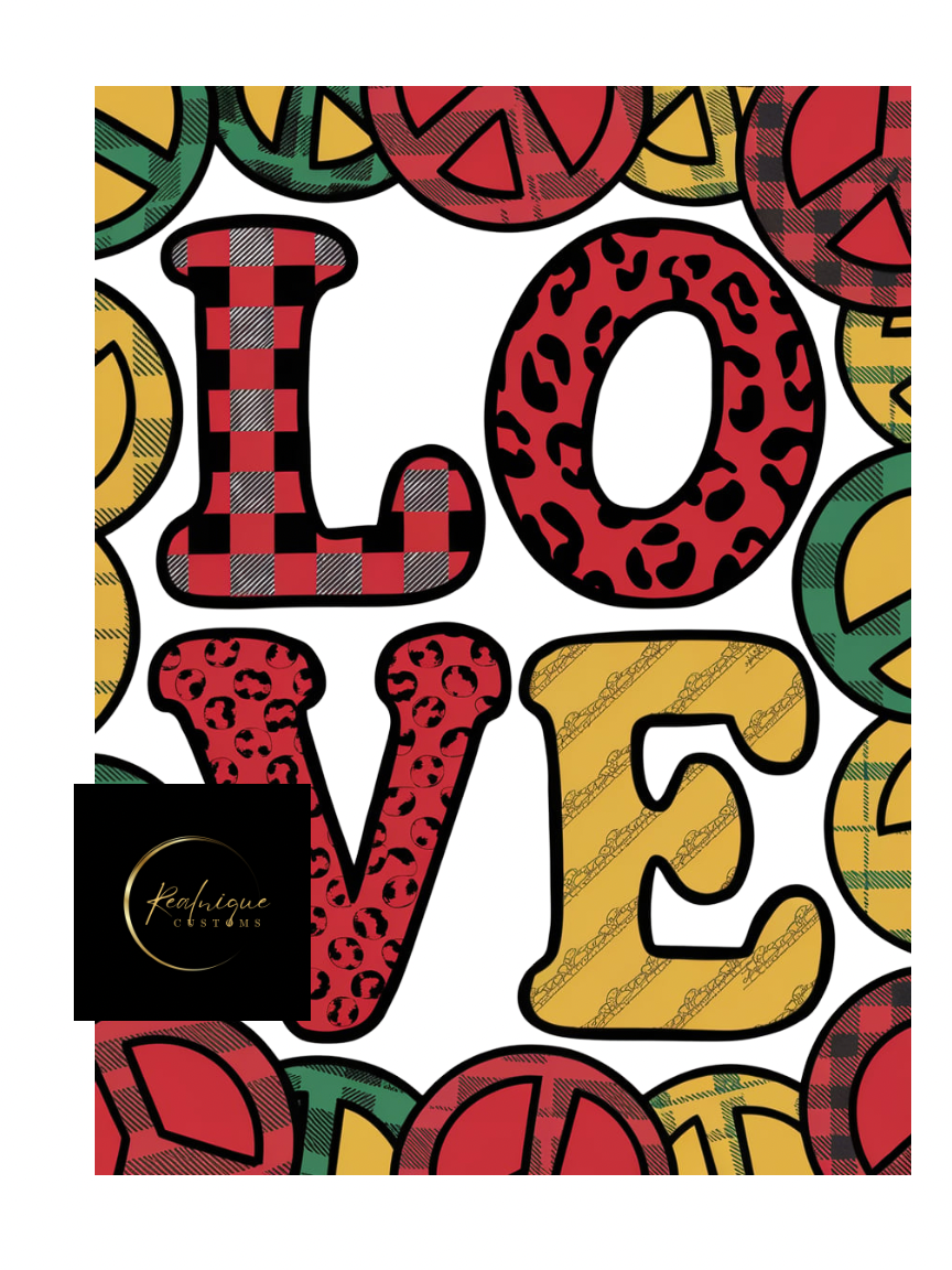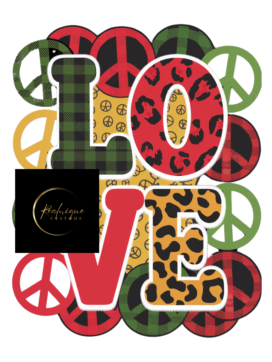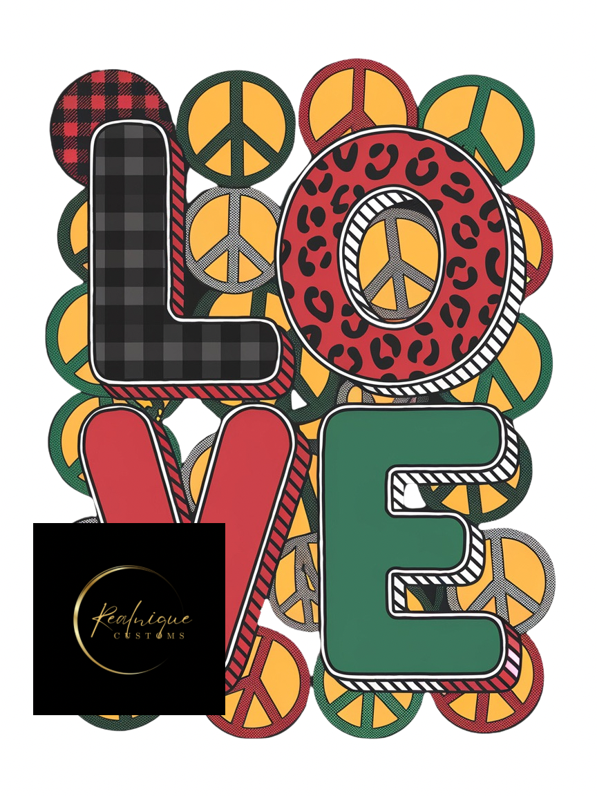 This Black History Afrocentric-inspired 6 piece PNG collection typography and vibrant peace sign patterns, symbolizing LOVE unity, pride, and cultural strength. Each design incorporates red, green, yellow, and black hues, along with plaid and animal print textures, paying homage to African heritage and the ongoing fight for peace and equality.