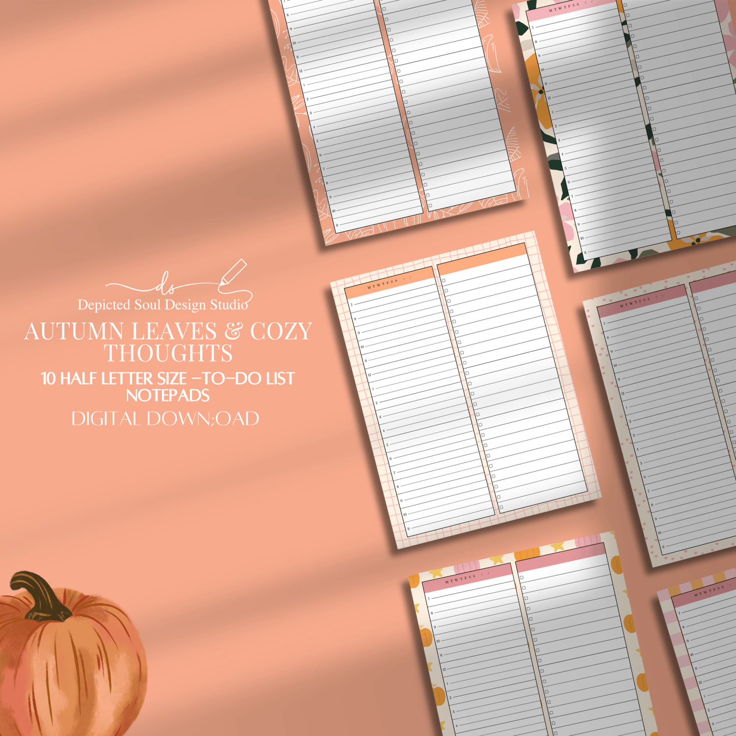 Welcome the cozy vibes of fall with our Autumn Leaves & Cozy Thoughts printable notepad set! Designed for lovers of all things autumn, this collection of half-letter-sized notepads is perfect for staying organized, jotting down daily reflections, and creating to-do lists from the comfort of your own home. With 10 unique designs, you’ll have the perfect seasonal touch for every note or task. Just download, print, and enjoy!