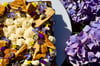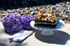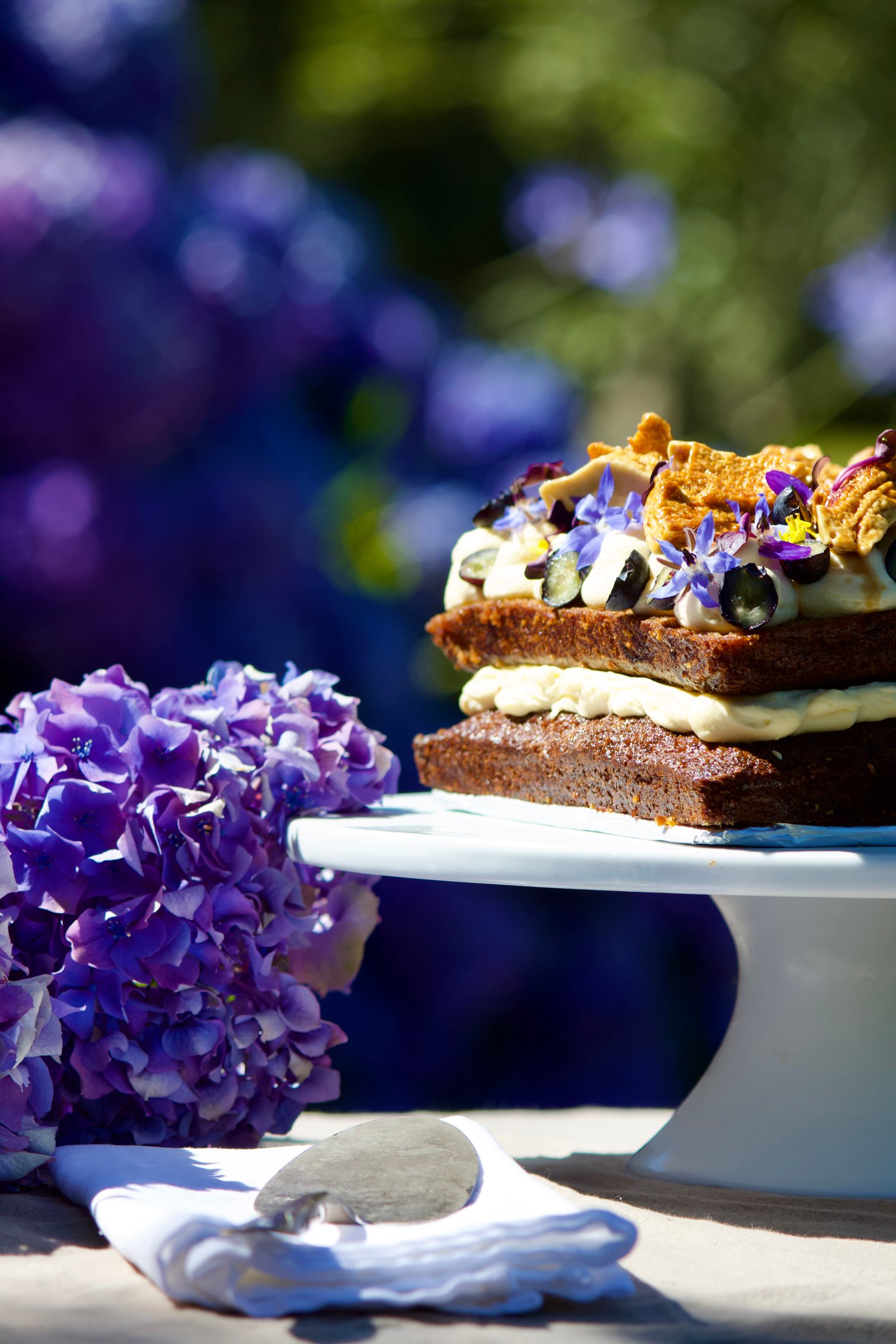Spiced carrot cake filled with mascarpone cream and topped with honeycomb and fresh seasonal fruit.