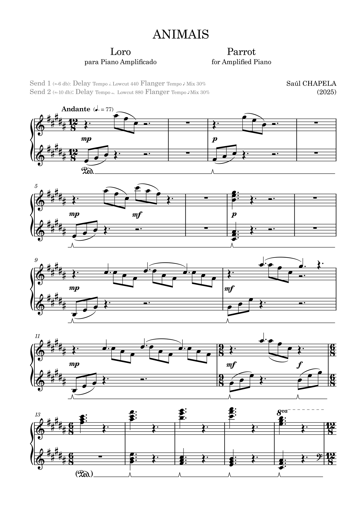 Loro para piano amplificado utiliza envíos para generar repeticiones de eco y se construye con poliacordes dentro de un lenguaje extremadamente diatónico.