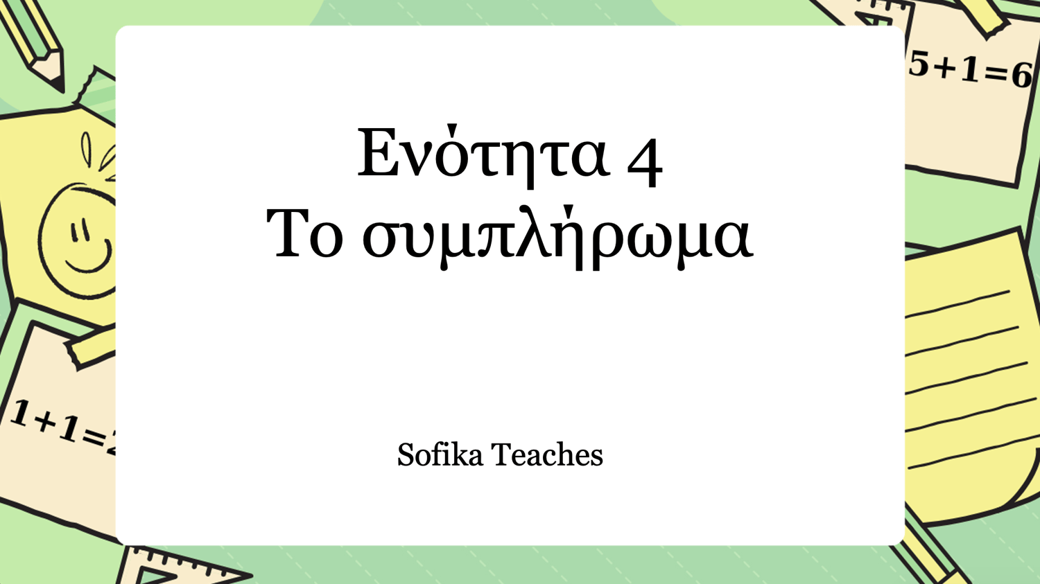 Η παρουσίαση αυτή αφορά το κεφάλαιο των Μαθηματικών της Α΄ τάξης, στο οποίο οι μαθητές μαθαίνουν να βρίσκουν το συμπλήρωμα ενός αριθμού μέχρι το 10.