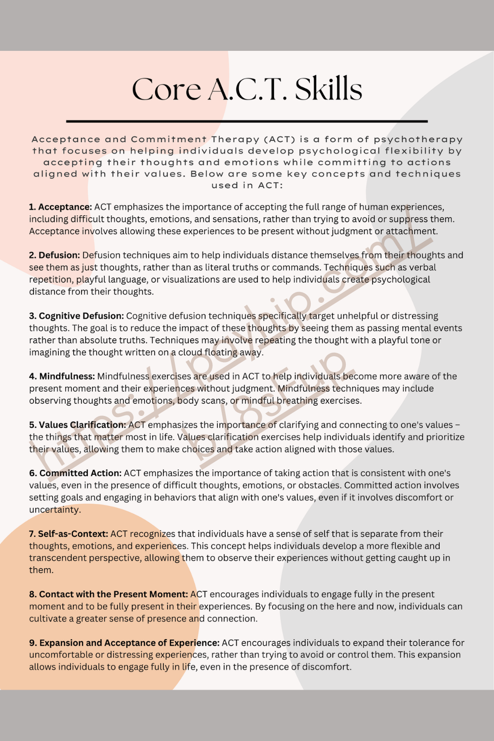 Acceptance and Commitment Therapy (ACT) is a form of psychotherapy that focuses on helping individuals develop psychological flexibility by accepting their thoughts and emotions while committing to actions aligned with their values. This worksheet highlights some key concepts for Acceptance and Commitment Therapy.
