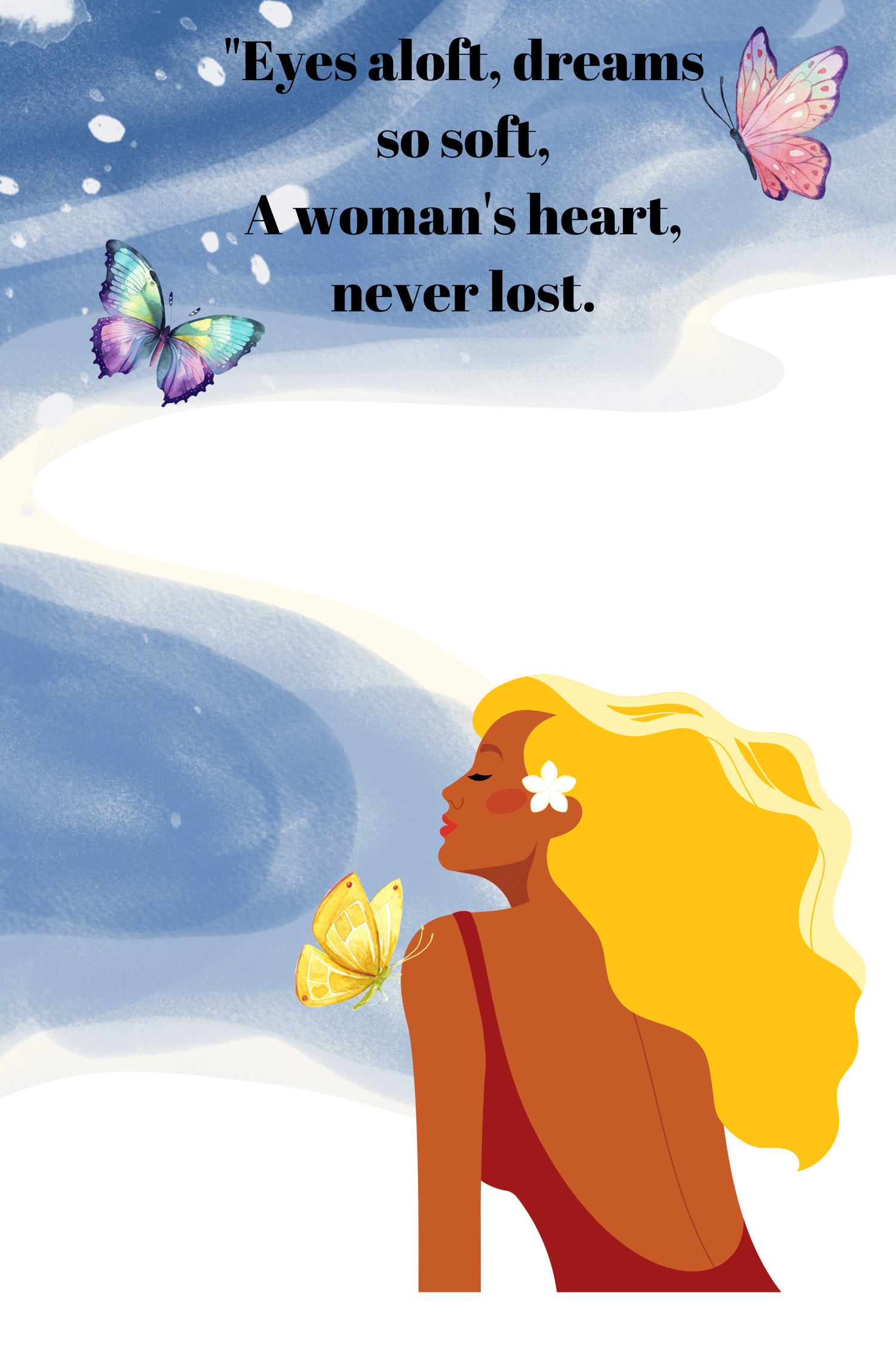 A serene scene of a lady on a beach, with a peaceful expression, gazing up at the sky. The lady is wearing a red bikini her hair gently blowing in the sea breeze. The beach is quiet with soft waves lapping the shore, and the sky is a mix of gentle pastel light blue color. The quote "Eyes aloft, dreams so soft, a woman's heart never lost." iQuote used on this picture