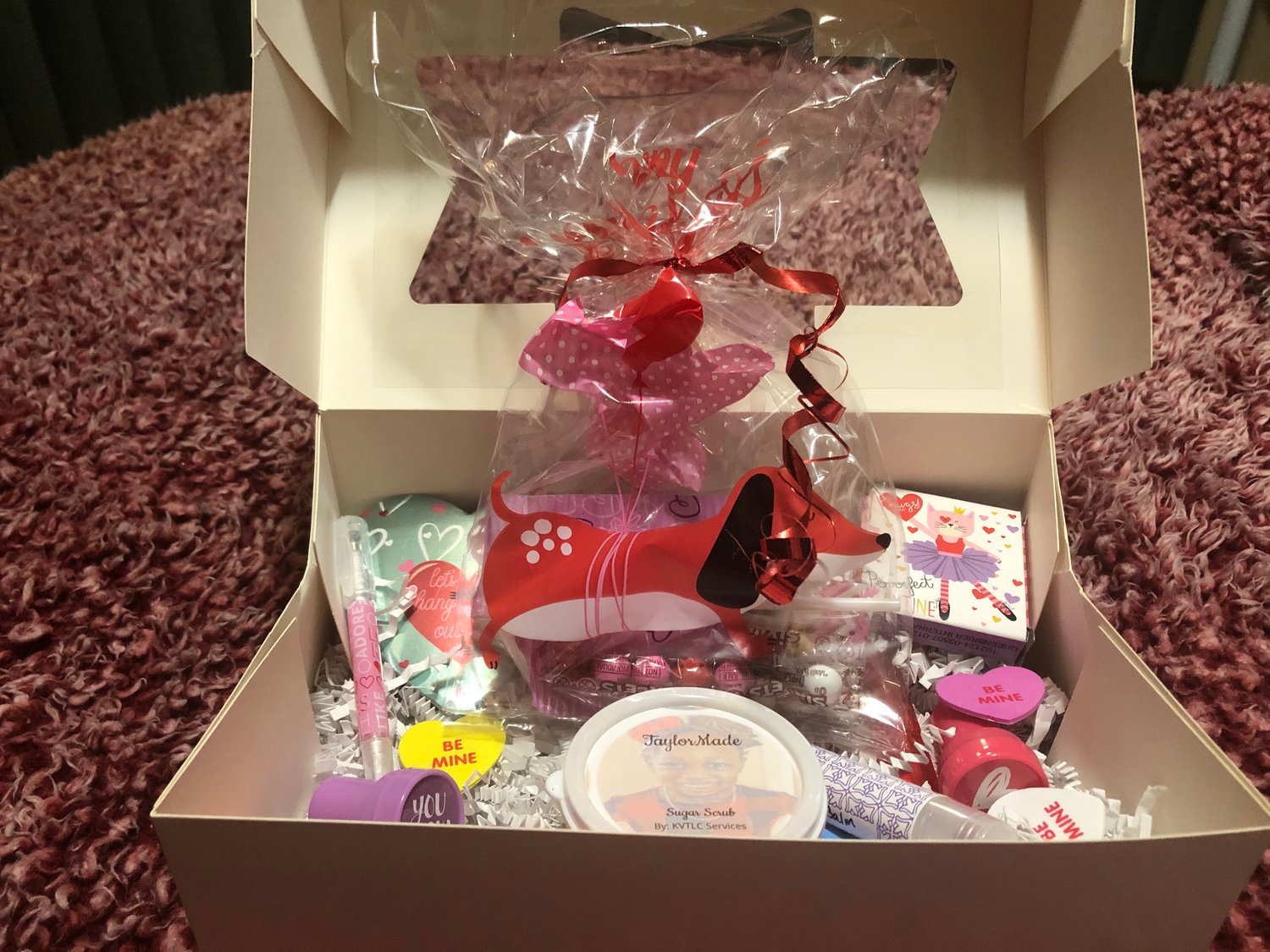 Homemade with love by Taylor who is 5 years old! Boxes include: TaylorMade Sugar Scrub, Homemade lip balm, bubbles, stickers, candy, note pad, ink pen, Valentine's Day stamps!