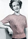 This lovely late 1940s short sleeve jumper has a leaf patterned lace design and fastens on the shoulder