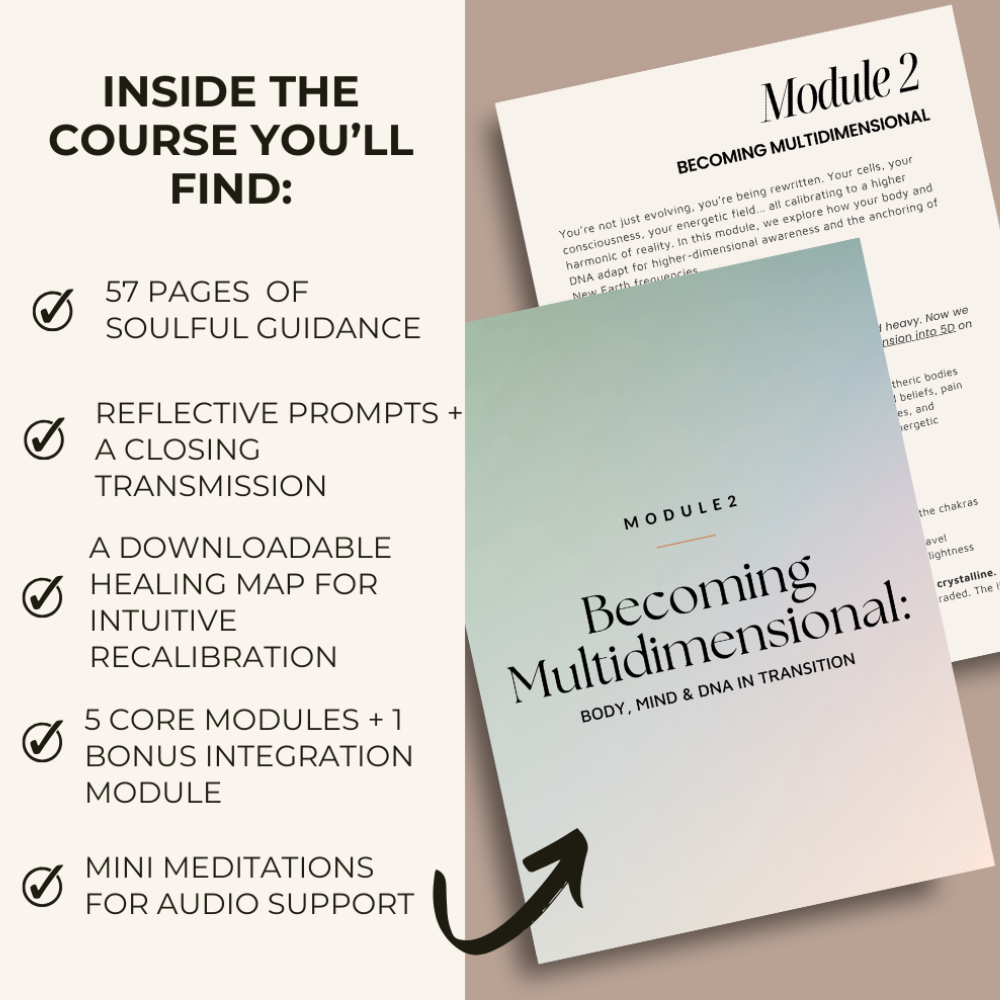 A beautifully designed, energetically attuned 6-module course to help you navigate awakening symptoms, decode multidimensional shifts, and anchor clarity in your daily life. Helping you move from overwhelm to clarity with tools, practices, and gentle structure.