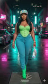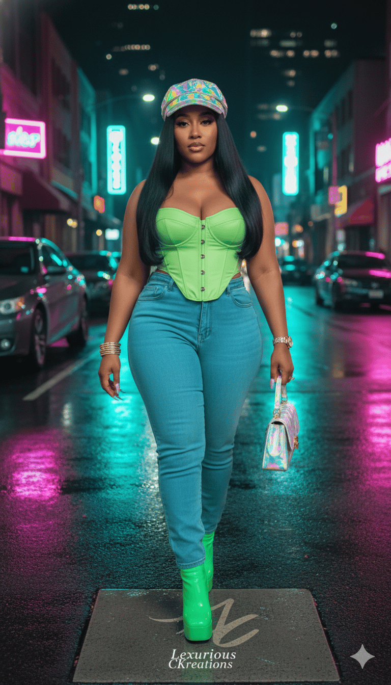 Each prompt features a curvy African-American woman styled in color-rich street-glam settings, from city alleys to rooftop dreamscapes. Expect rich textures, radiant lighting, and high-end editorials.