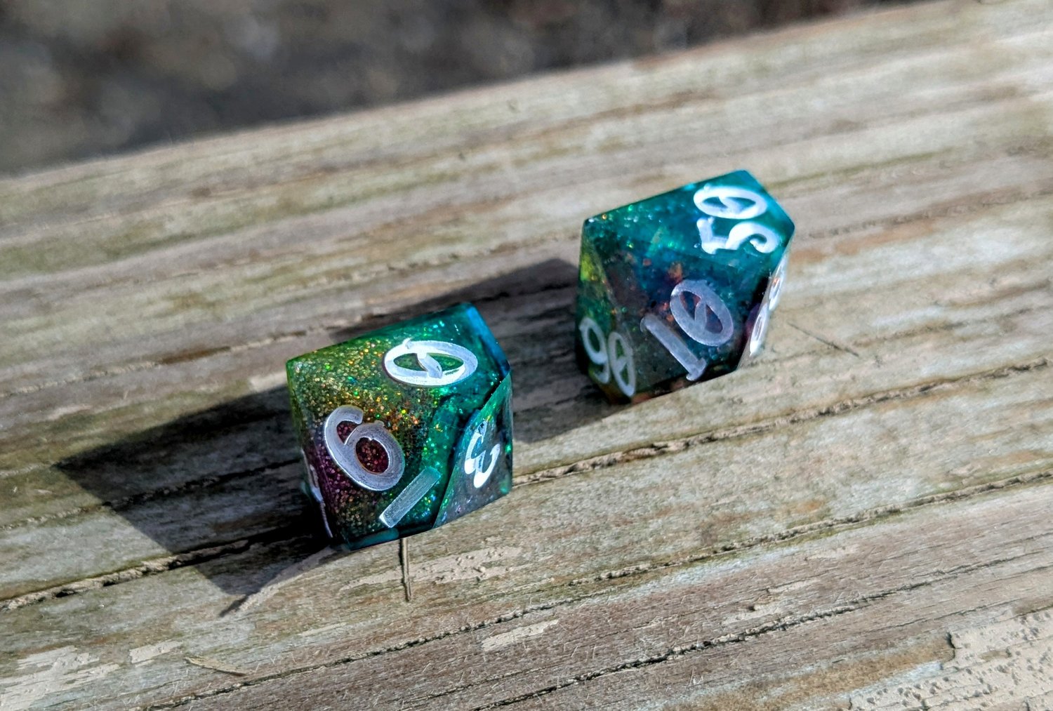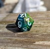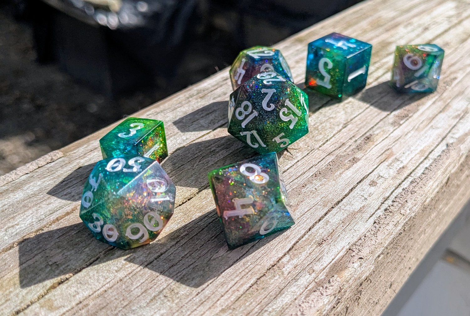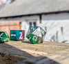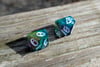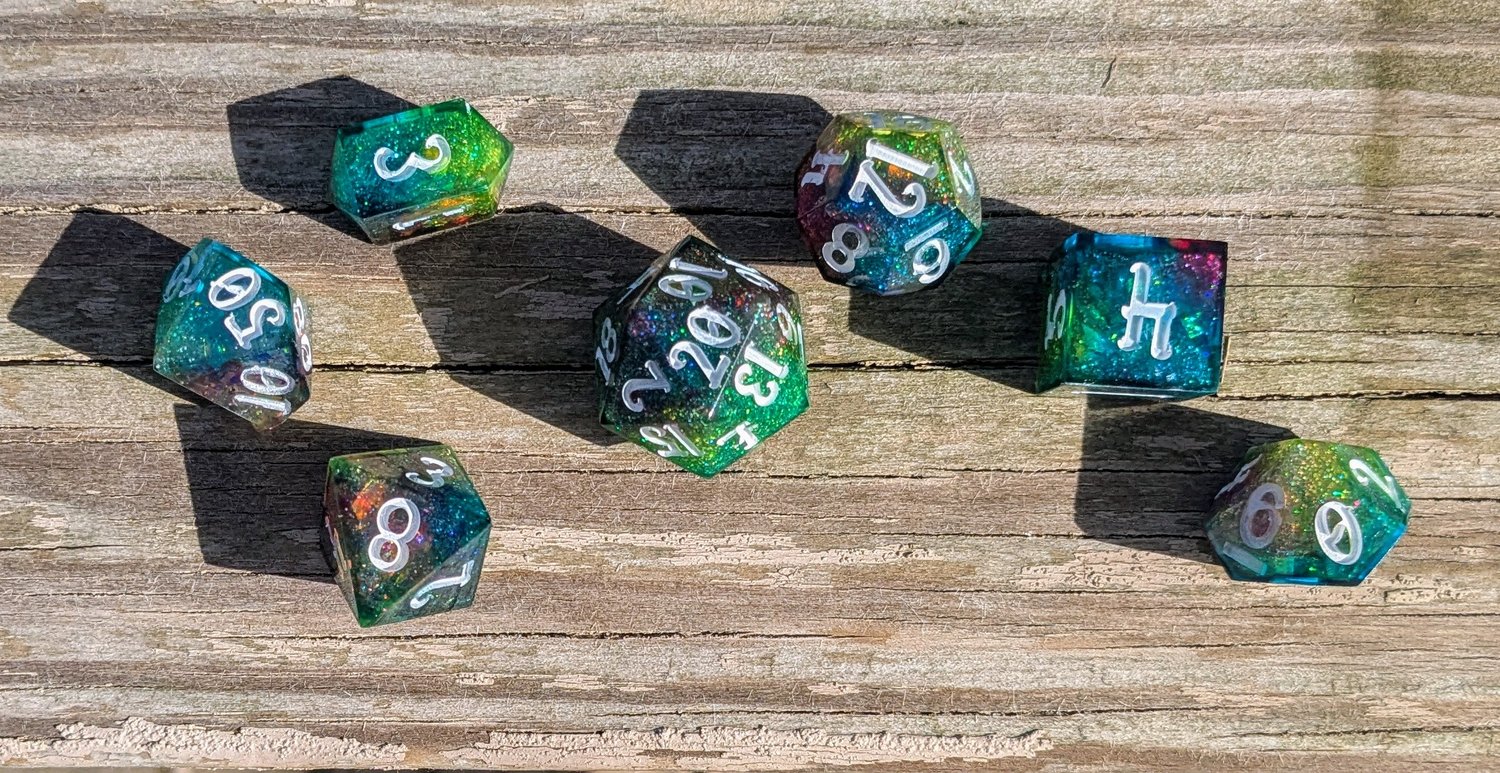 Bright, bold, and ever-shifting, this set channels pure arcane energy. Teal and green tones clash and swirl with flashes of blue, magenta, and silver—like a spell caught mid-cast. Finished with white ink for maximum contrast, these dice are loud in the best way.