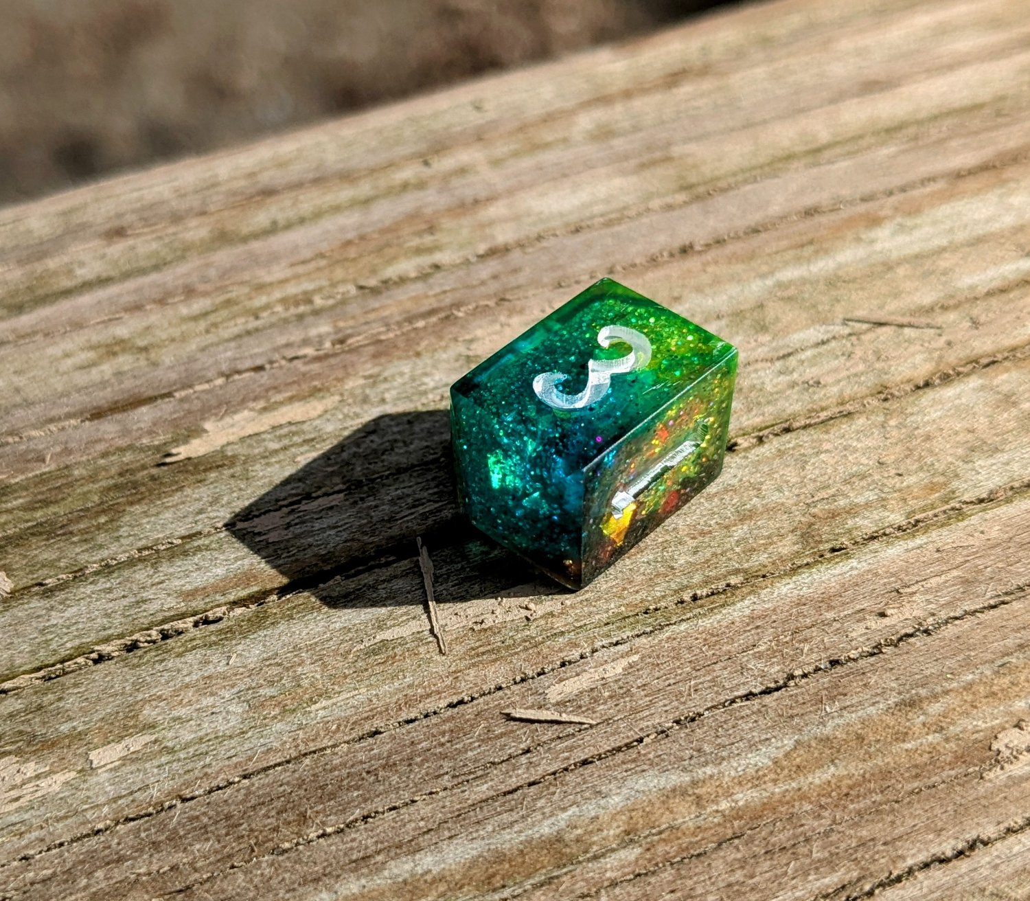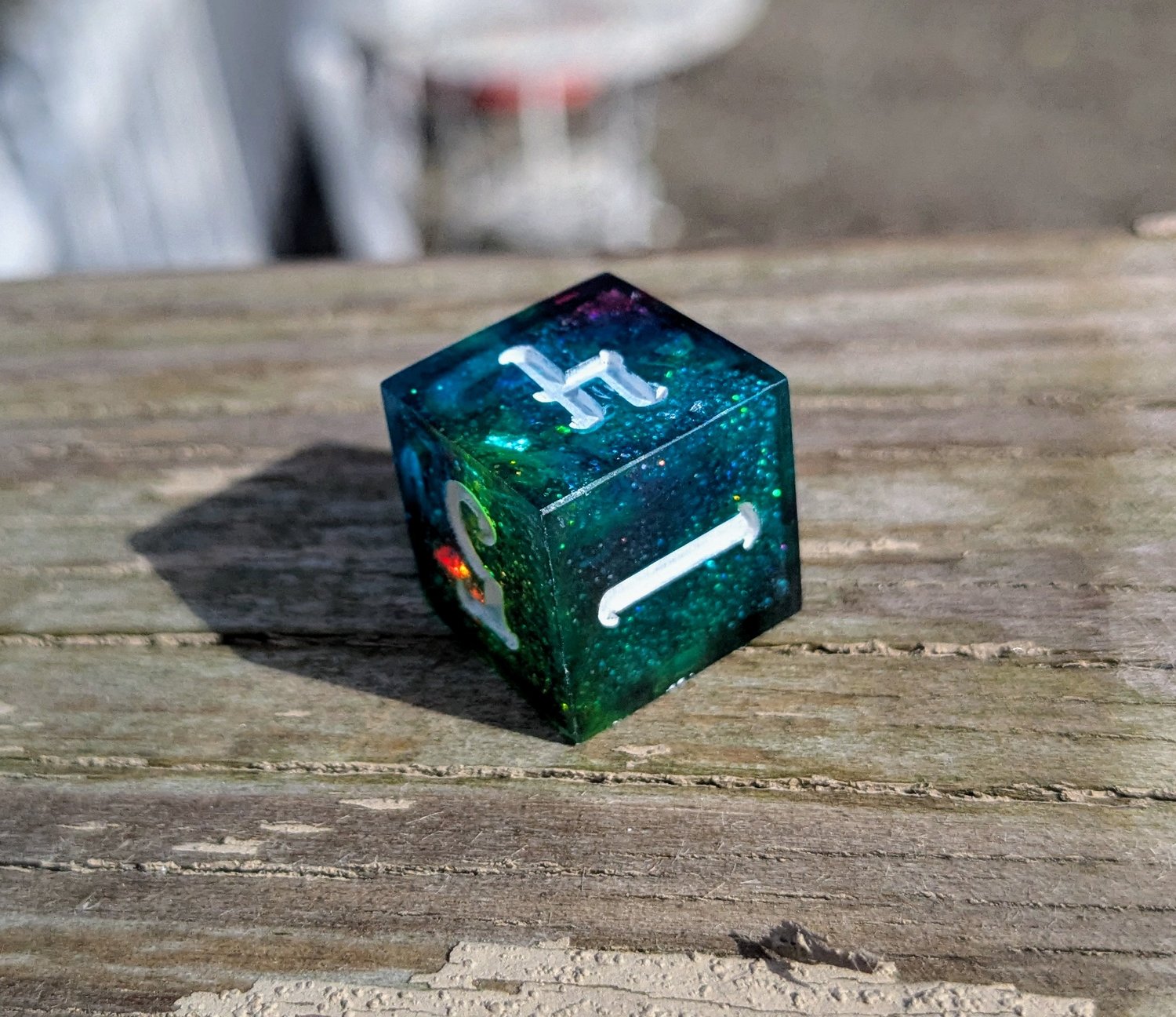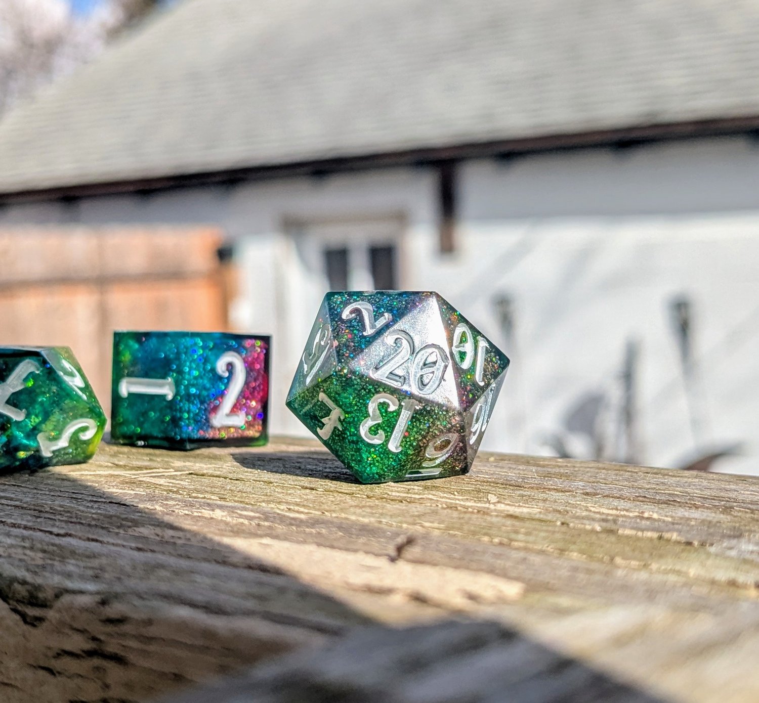 Bright, bold, and ever-shifting, this set channels pure arcane energy. Teal and green tones clash and swirl with flashes of blue, magenta, and silver—like a spell caught mid-cast. Finished with white ink for maximum contrast, these dice are loud in the best way.