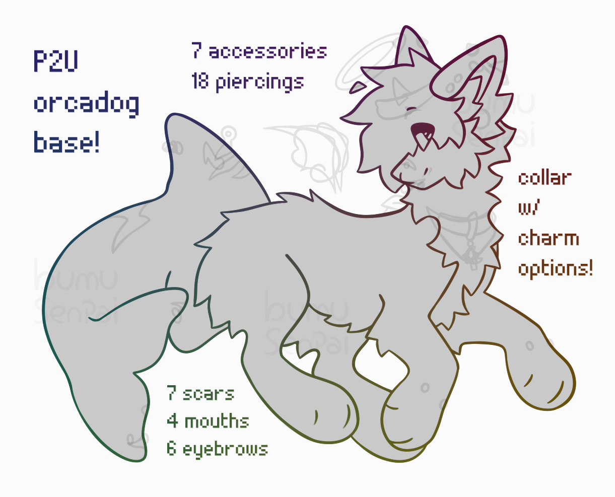 An orcadog base this time! Has multiple options for piercings, accessories, scars and expressions.